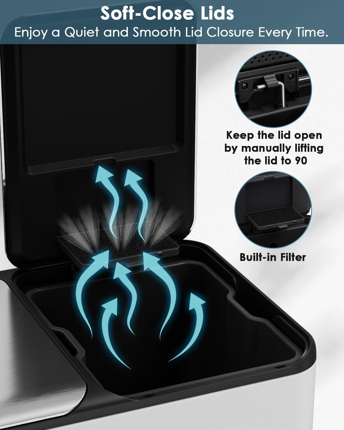 Arlopu 16Gal Dual Trash Can w/2 Built-in Box for Odor Control, Hands-Free Kitchen Garbage Bin, Recycle Waste Dustbin, Soft-Close Lid, 2 Buckets,Foot Pedal, Side Handle, Airtight,for Home Office