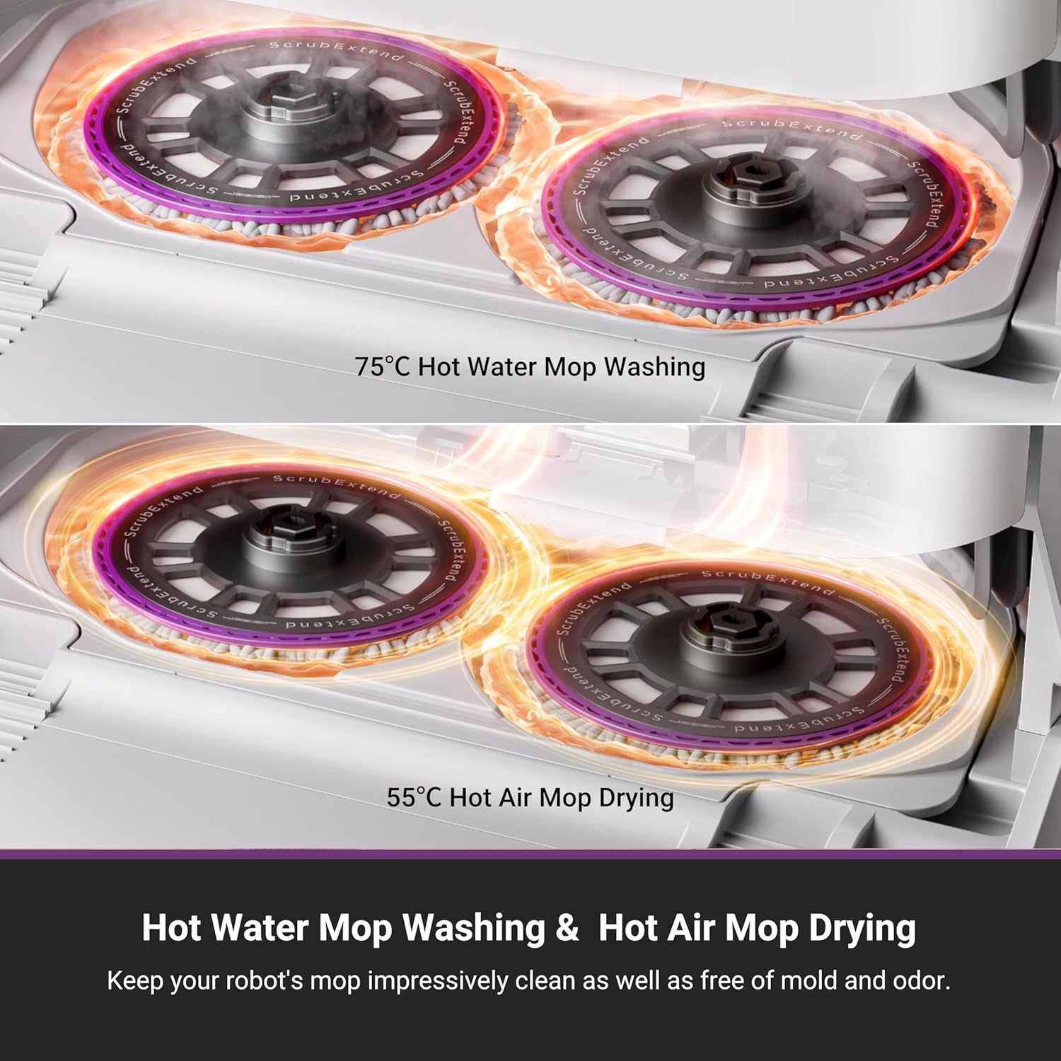 - UP TO 75 DAYS OF HANDS-FREE MAINTANENCE: 8-in-1 Functional Base automatically empties debris along with automatically refilling water and hot water mop washing and drying. J15 Pro Ultra's mop pads are washed with 75°C(167°F) hot clean water, then dried with 55°C (131°F) heated air reducing mold & mildew. With battery charging and dock self-cleaning, enjoy hassle-free cleaning.