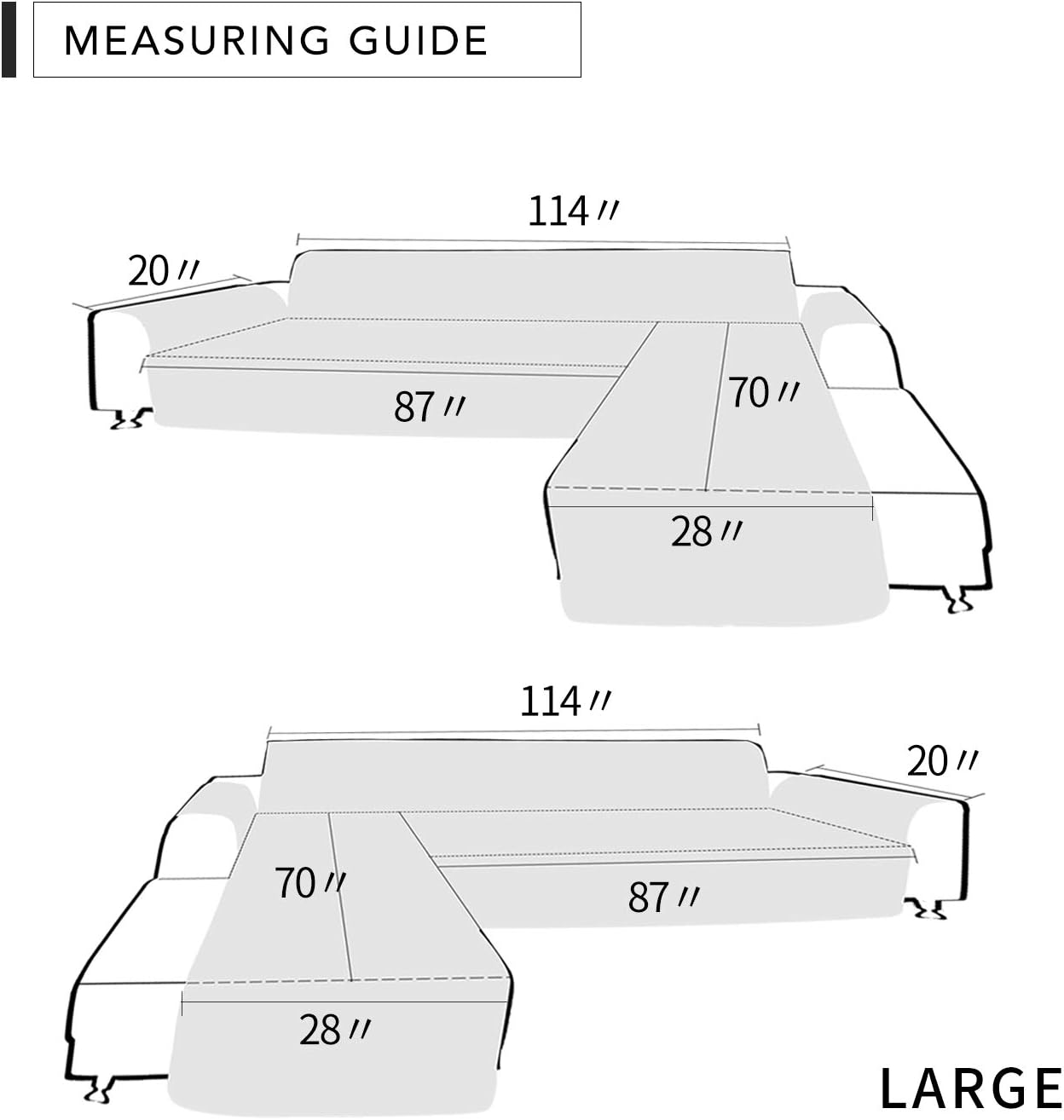 - Dimension: We have three sizes to choose. Please measure before purchasing. See measuring guide in photos. One sofa cover also suitable for L-Shape Sofa Left and L-Shape Sofa Right.