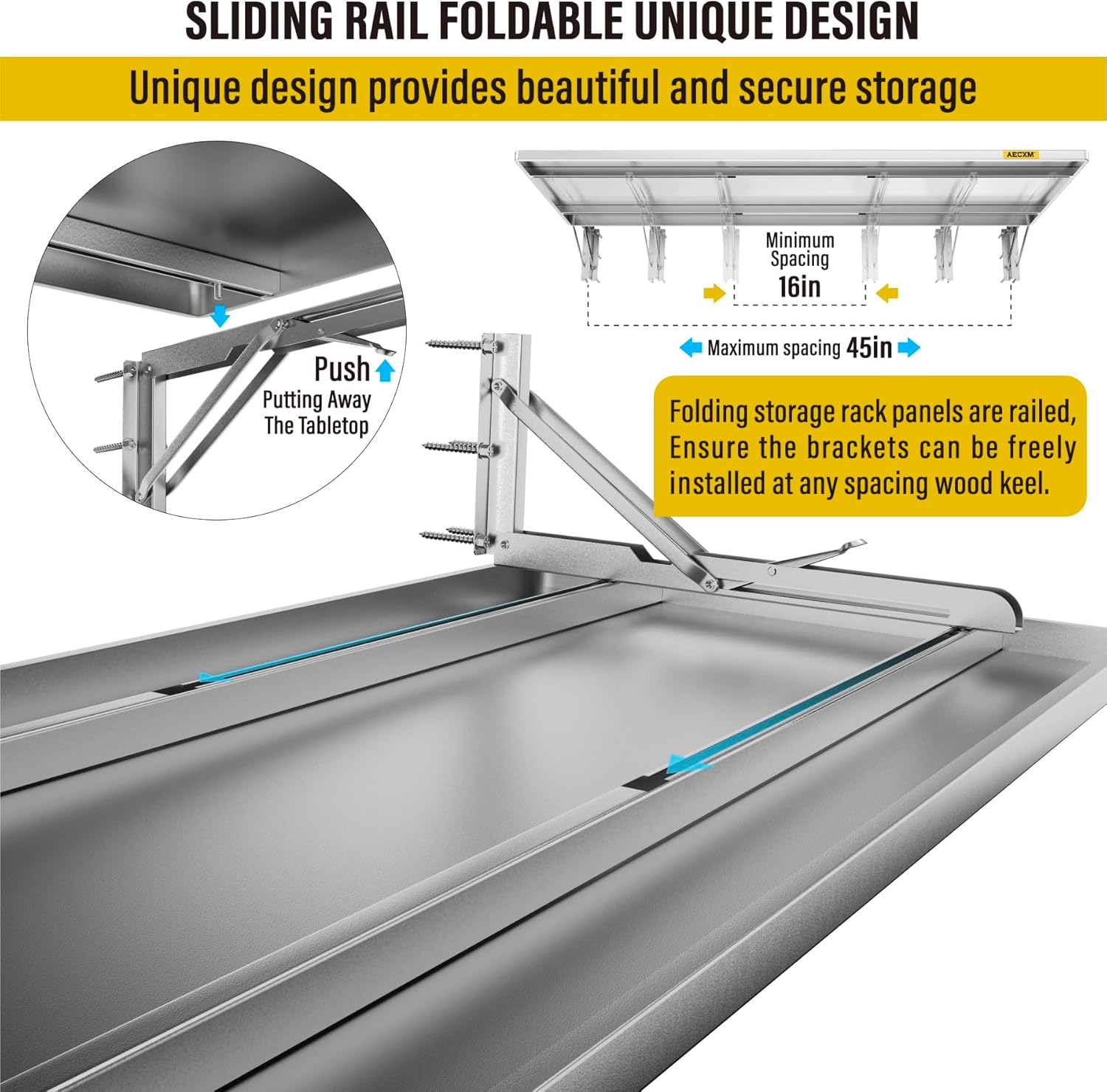 - SUPERIOR DESIGN: The foldable garage storage shelf panel is made of whole steel plate, The surface of matte high temperature powder baking paint, Flat and smooth, Panel with sliding rail design, The bracket can be installed freely in the range of 12"-45" spacing of wood wall keel, And at the same time it adopts folding bracket, Which can be freely stowed away or unfolded
