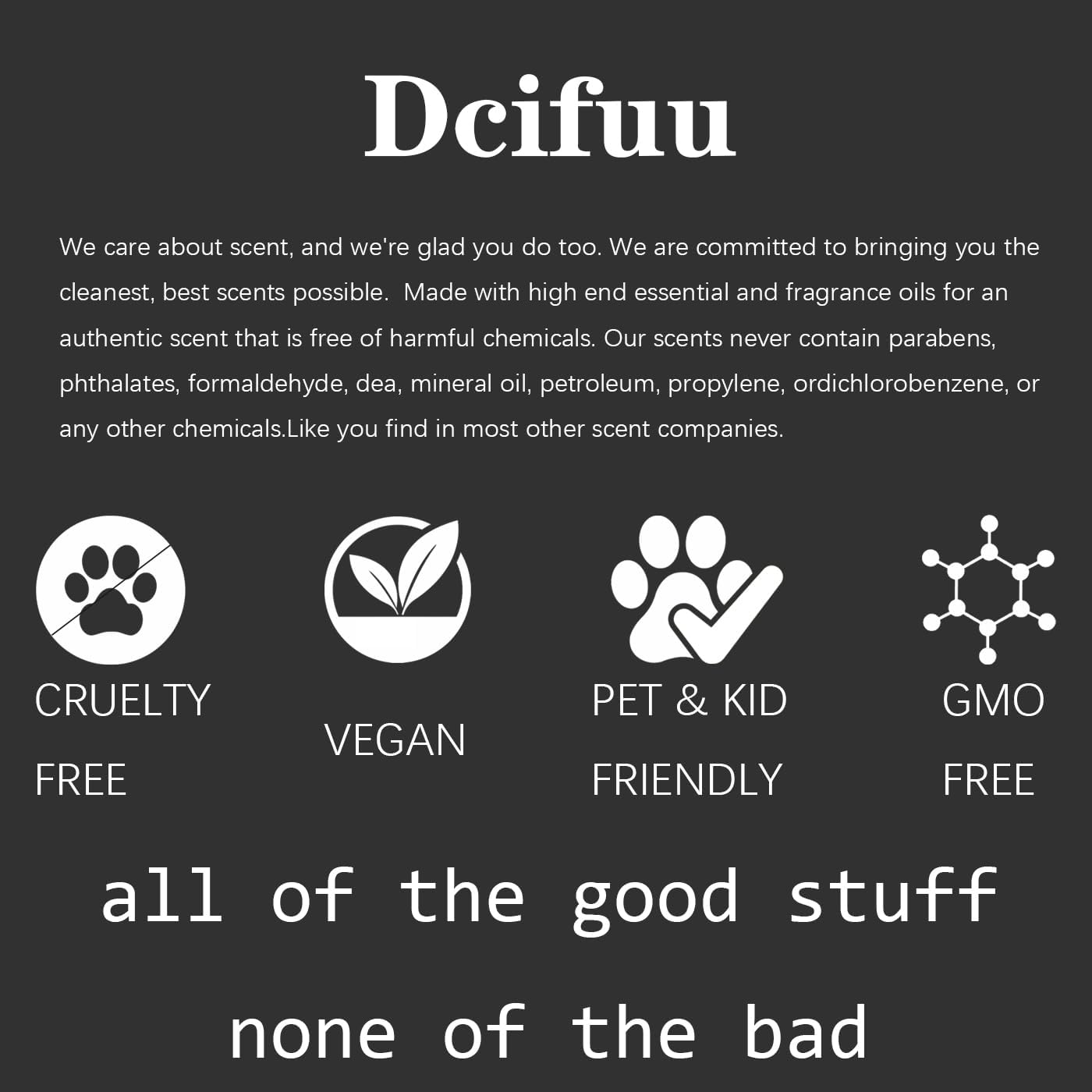 - LONG LASTING: Use our natural blend of essential oils and fragrance oils to give off a captivating scent that is free of harmful chemicals throughout the day. Looks good, smells good, everything is good