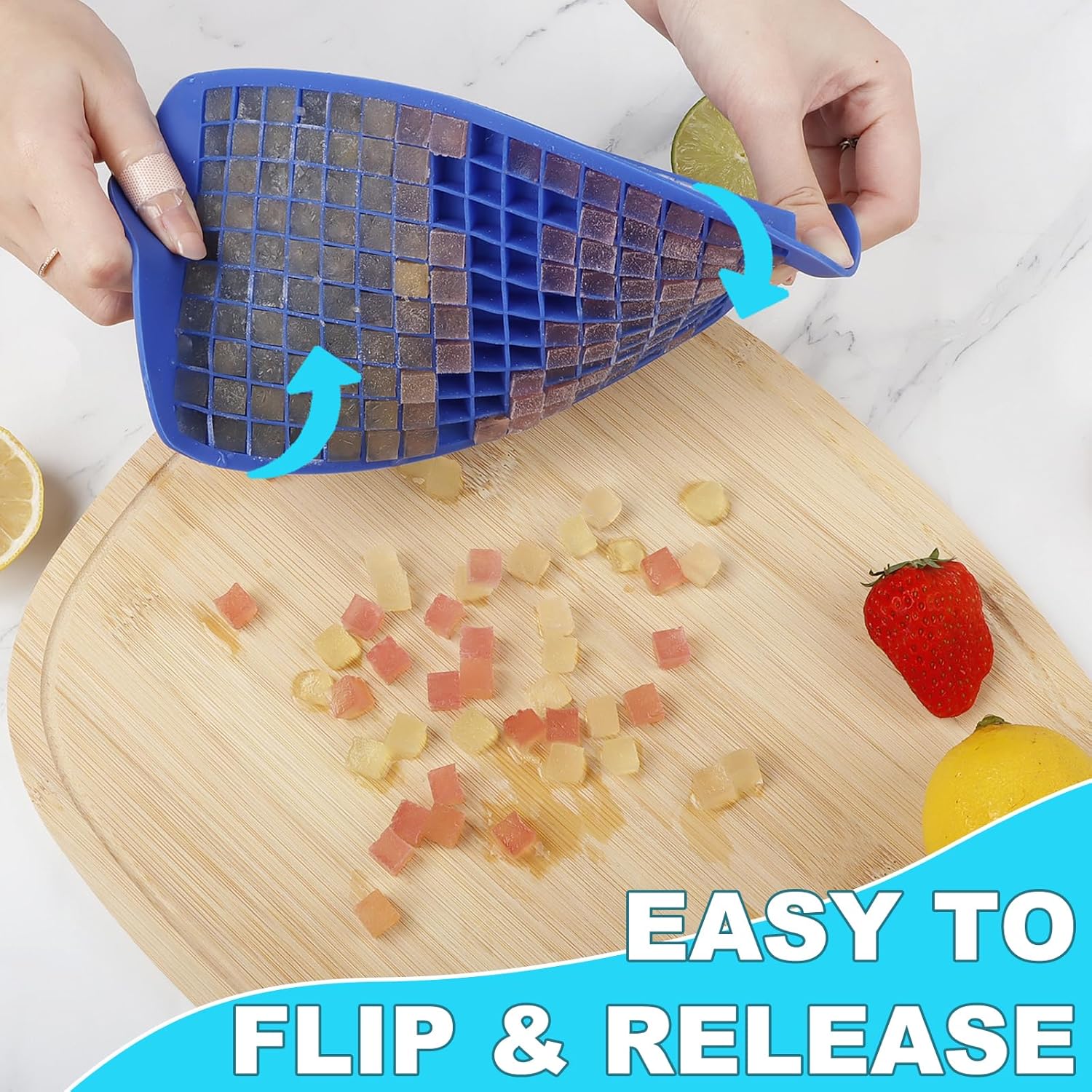 - [EASY ICE REMOVAL]: No more struggling to pry them loose or waiting for them to melt. Just twist the ice cube tray to easily remove a large tray of ice cubes. Silicone material is flexible and can restore immediately after being twisted. The silicone ice cube tray features a non-slip bottom design, minimizing spills or drips compared to other ice cube trays with smooth bottoms, and during the freezing process, it will not stick to the ice cubes, helping to release the ice cubes more easily. No more messy freezers or wasted water!