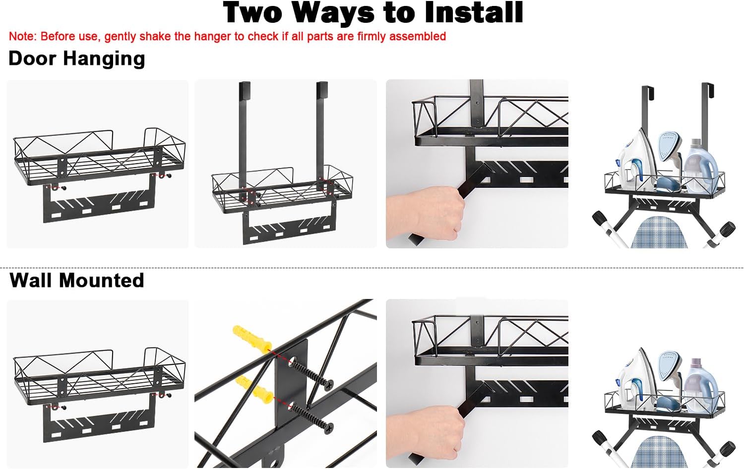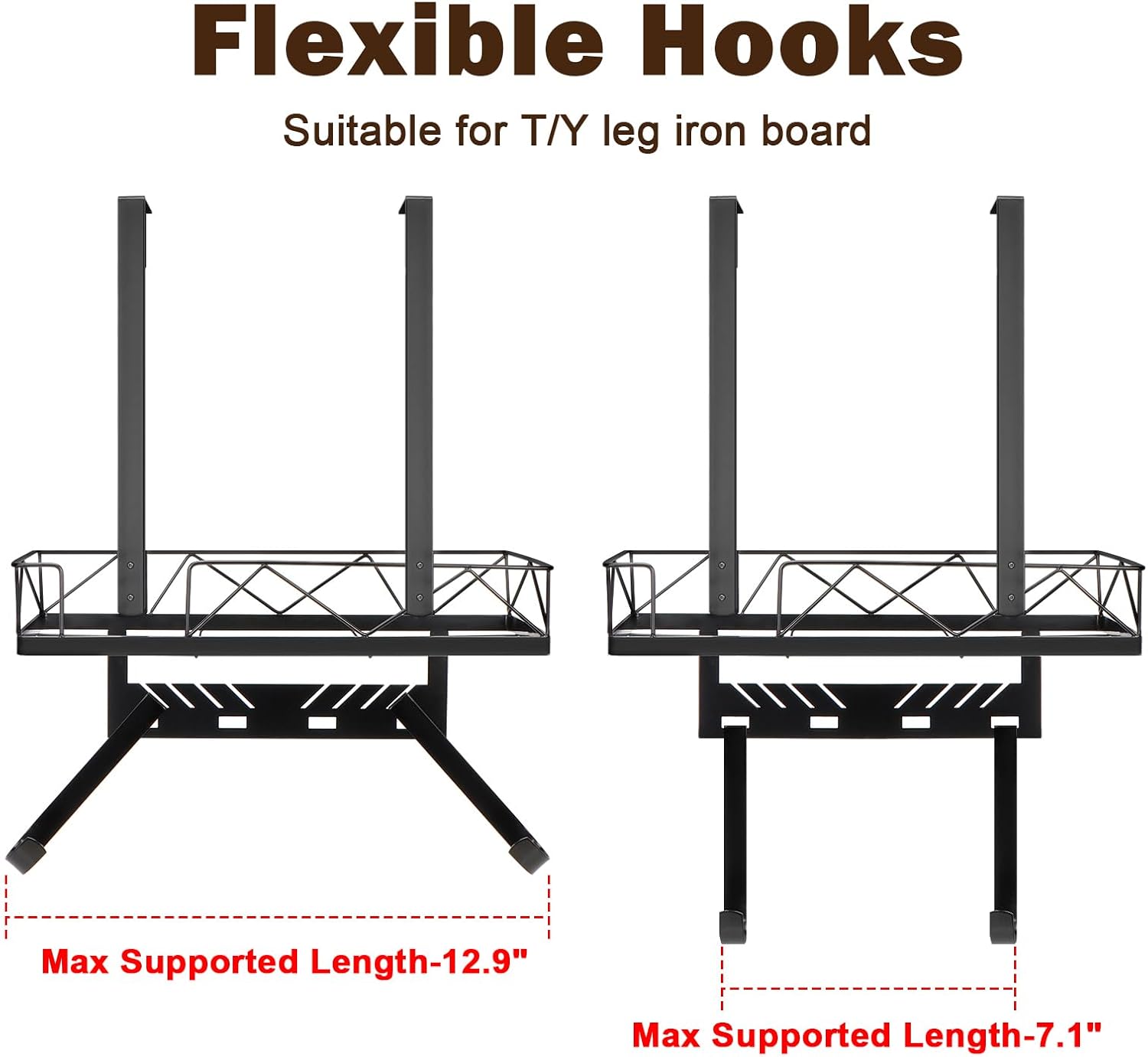 - ADJUSTABLE AND PRACTICAL DIMENSIONS: Adjustable hooks fit most standard ironing boards, suitable for T or Y shaped boards; Basket opening wide is 3 in, convenient to place and take out the iron; Note: Keep a 0.09 in door gap to keep door hangers from rubbing against of door top