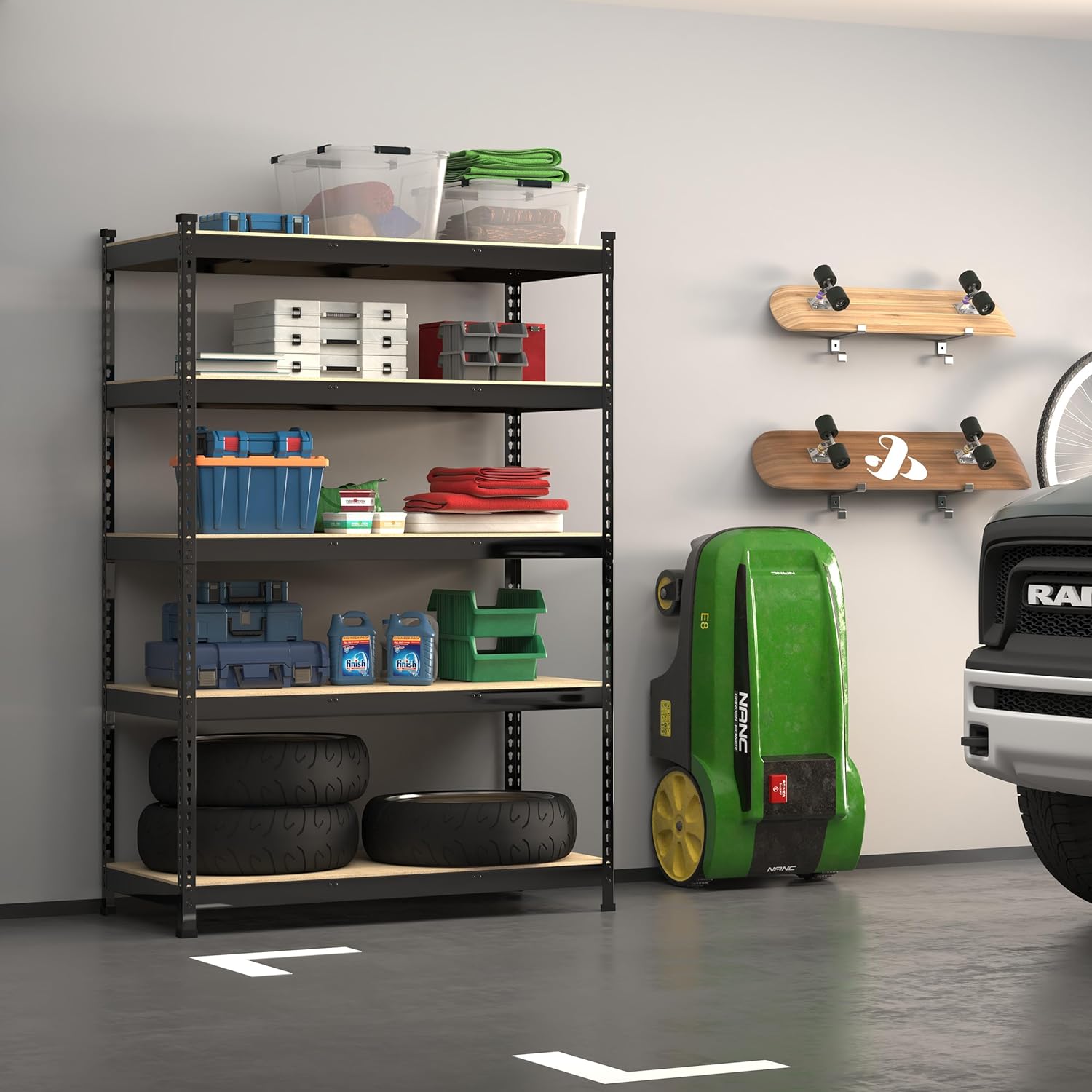 - 【Heavy Duty Garage Shelving Unit】The 5-tier heavy duty garage storage shelving unit is constructed from high-quality thick MDF boards and a heavy-duty metal frame with a premium powder-coated finish surface. Each shelf layer is equipped with 2 middle support beams. It's not only sturdy and long-lasting, but also ensures the shelf maintains its appearance and performance in various environments. Each shelf holds up to 600 lbs, 5 tier shelves' total max load weight is 3000 lbs
