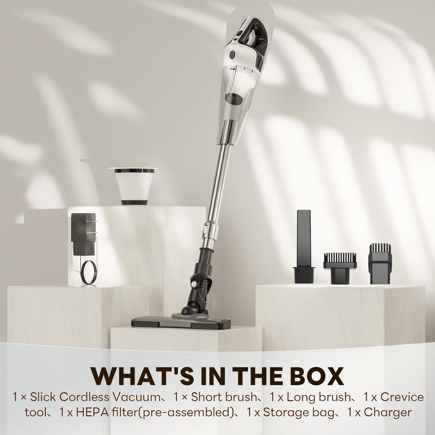 - Included Components : 1x Stick Cordless Vacuum; 1x Short brush; 1x Long brush; 1 x Crevice tool; 1 x HEPA fitertpre-assembled; 1x Storage bag; 1 x Charger 1x Stick Cordless Vacuum; 1x Short brush; 1x Long brush; 1 x Crevice tool; 1 x HEPA fitertpre-assembled; 1x Storage bag; 1 x Charger