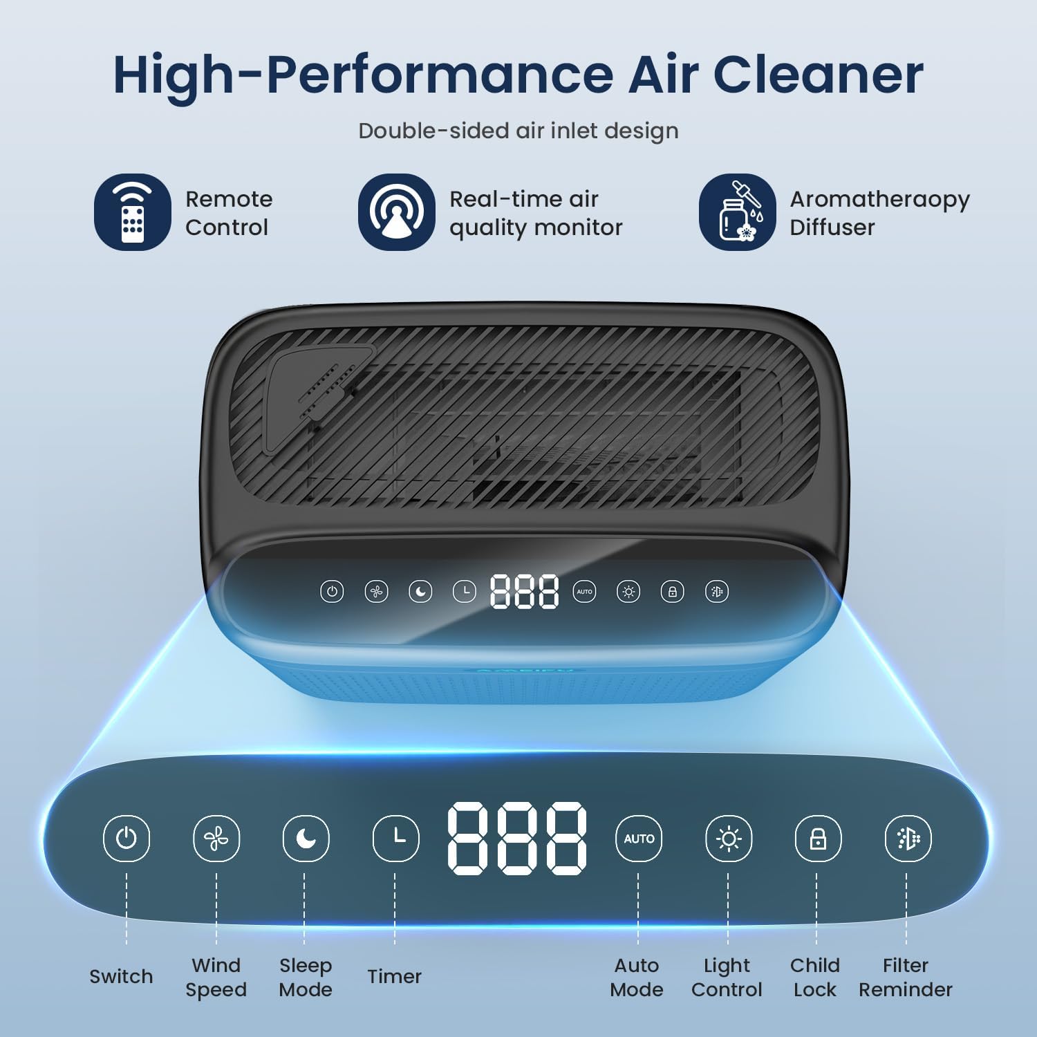 - 𝐇𝐢𝐠𝐡 𝐏𝐞𝐫𝐟𝐨𝐫𝐦𝐚𝐧𝐜𝐞 𝐐𝐮𝐢𝐞𝐭 𝐀𝐢𝐫 𝐏𝐮𝐫𝐢𝐟𝐢𝐞𝐫𝐬: Enjoy restful, undisturbed nights with our 15dB Sleep Mode and aromatherapy feature. Operating at an ultra-low noise level, it ensures minimal disruptions while promoting relaxation with soothing aromas, creating a serene and peaceful environment for deep, rejuvenating sleep. (What's more, all indicator lights turn off, which it will not interfere with your sweet sleep)