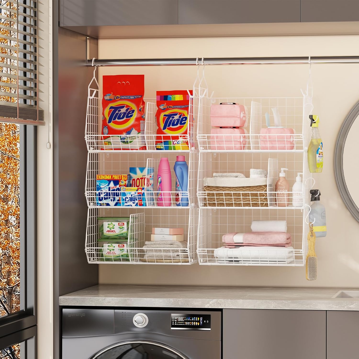 - Perfect Storage Organization: 5 tier wide open wire basket allows you to easily view, put in and take off more easily. Metal basket hanging shelves provide a great storage solution for any room in the home. Organize clothes accessories and toys in your closet, lotions in your bathroom, containers in your pantry, office supplies, mails in your office, fruit&vegetable&spices in your kitchen.