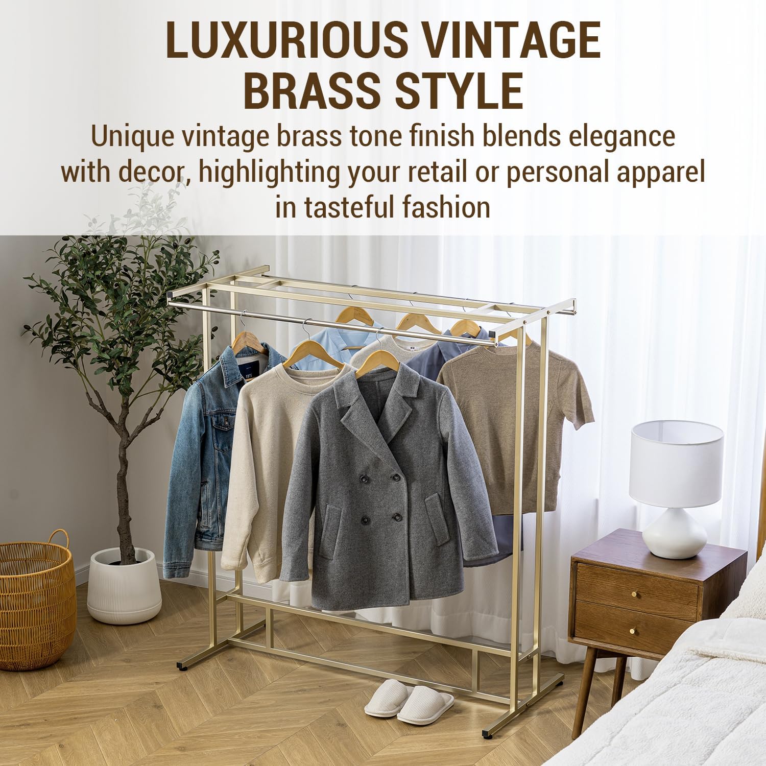 - 4 ft tall double rod clothing stand in brass-toned stainless steel, perfect for personal wardrobe overflow, or a modern retail merchandising display **Some assembly required**