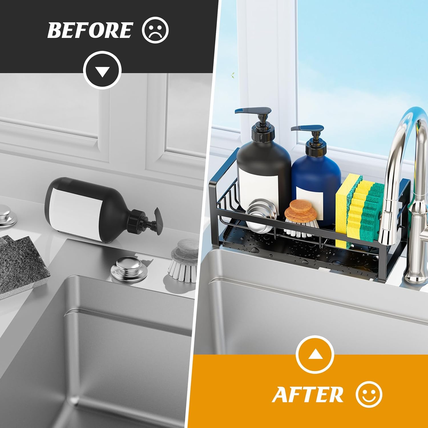 - 【Self-draining Design】Innovative kitchen sink caddy are designed with sloped and self-draining which can drains water into the sink effortlessly.Compared to a manual tray,this automatic drainage system allows us to save more cleaning time.It also ensures that your countertops stay clean,dry and tidy at all times