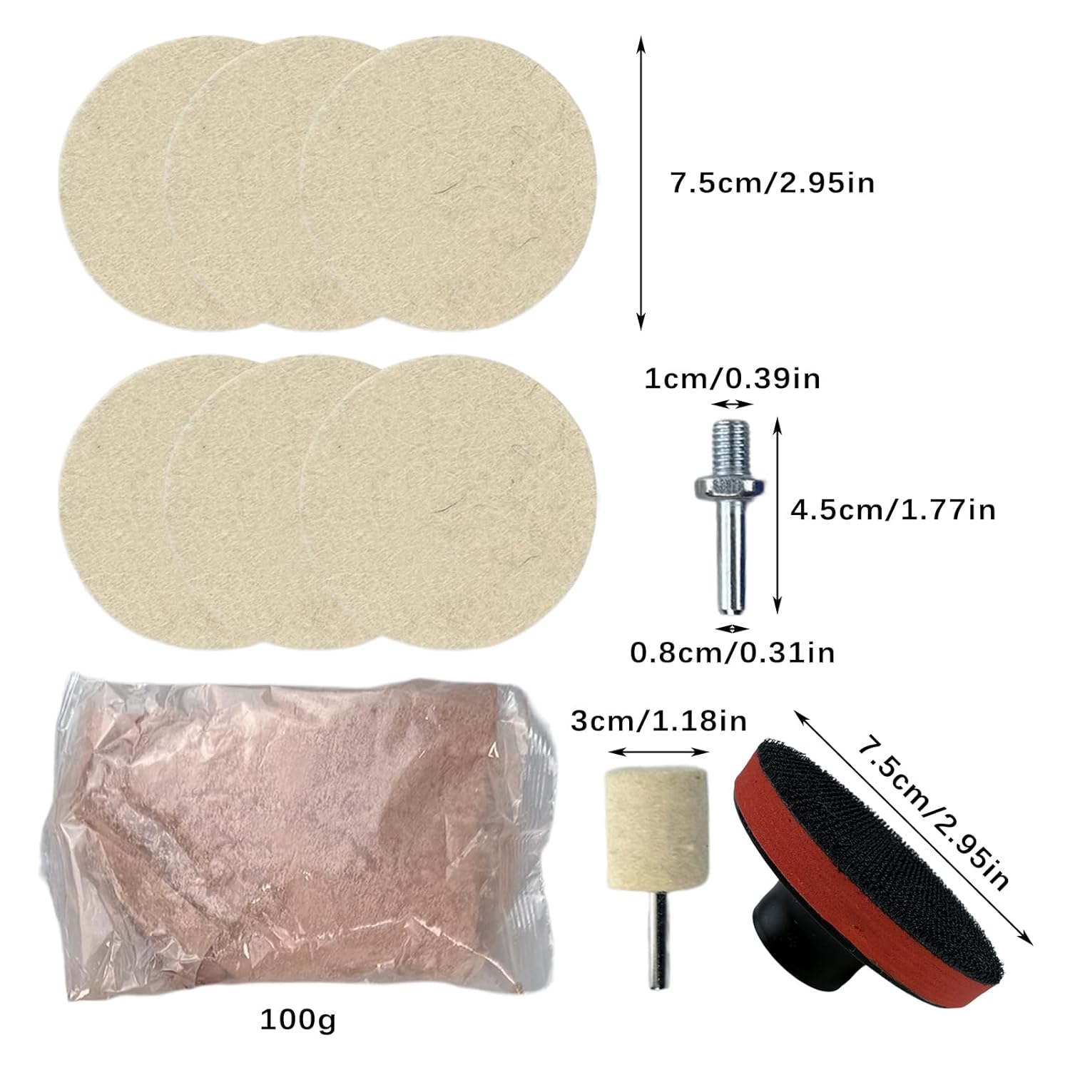 - Package Include: 1pc x 100g Cerium Oxide Powder, 5pcs x Wool Polishing Pad, 1pc x Polishing Disc for 6mm Drill Adapter, 1pc x Wool Wheel, 1pc x Towel.