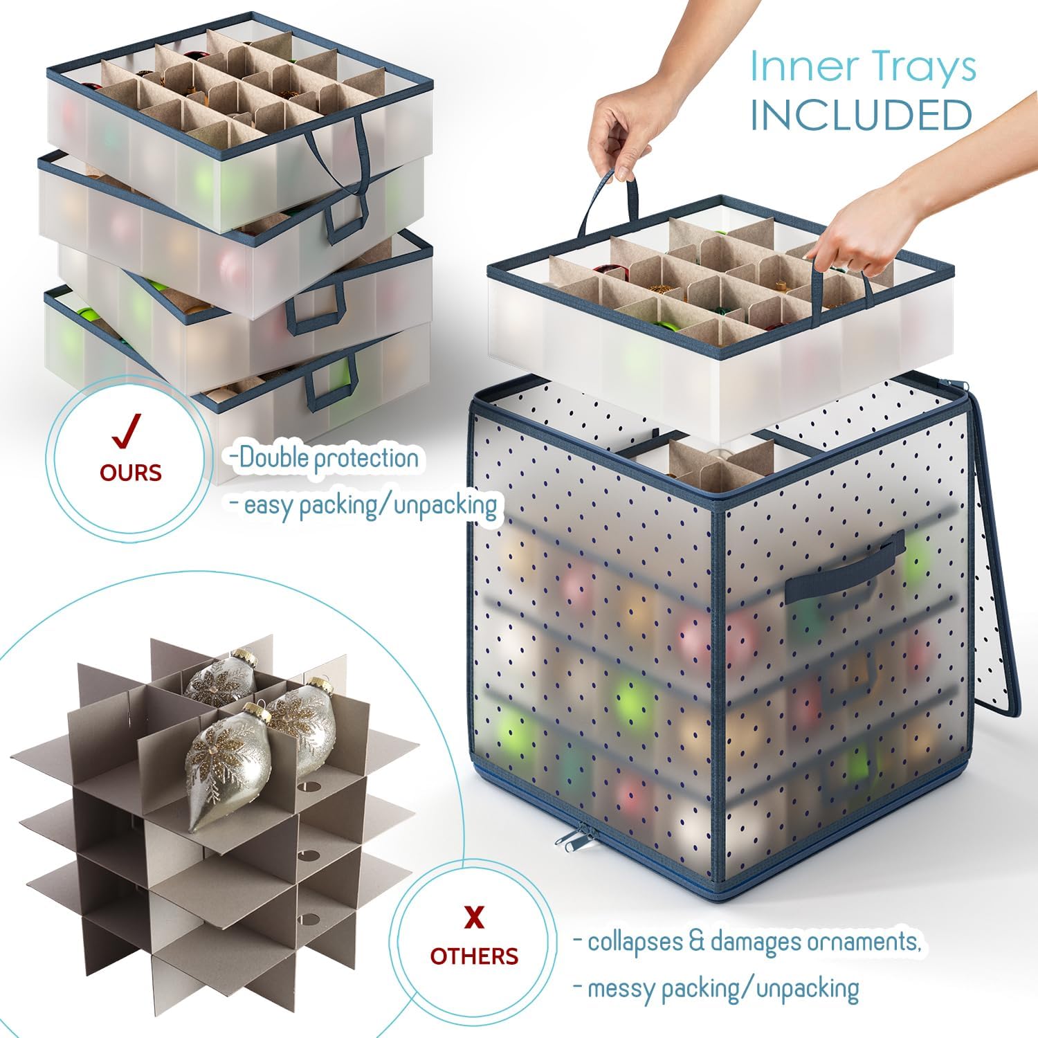 • Christmas Storage Boxes for All Decorations – Check out our store for a full line of Christmas storage boxes for all any holiday storage needs. Choose from a Ornaments Storage Box, Wreath Storage Container, Wrapping Paper Organizer, and Christmas Tree Storage Bag and more, all backed by our 30 day warranty.