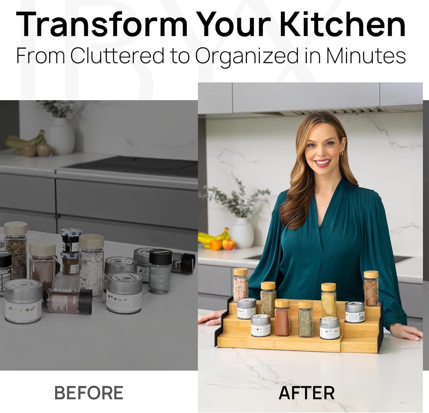 Ibyx Premium 3-Tier Spice Rack Organizer for Cabinet - Expandable Bamboo Spice Storage - Non-Skid Countertop Step Spice Shelf - Great for Kitchen Cabinet Countertop (Natural - Wide)