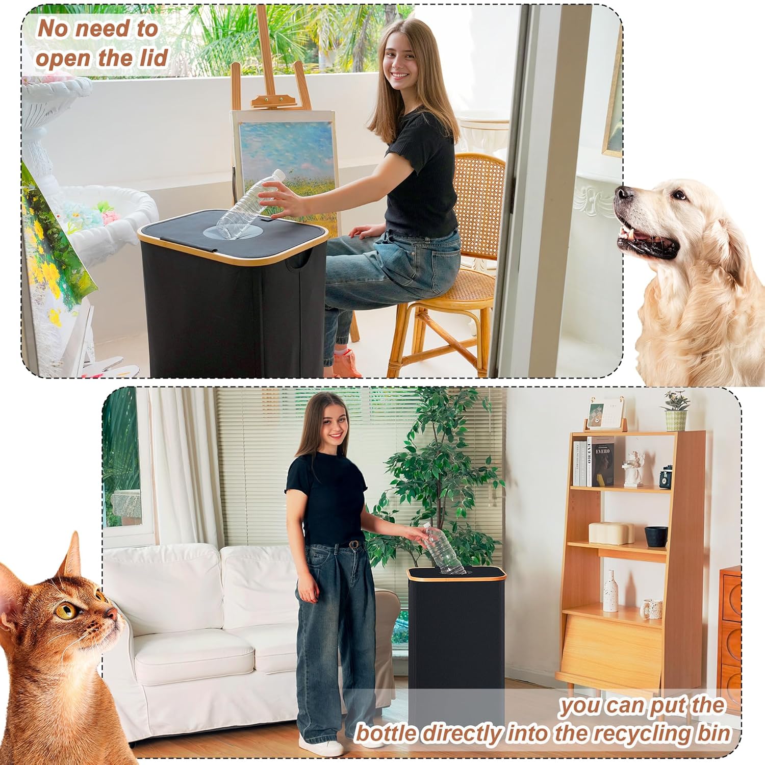 - 【Dual Inner Bag Design】Equipped with two interchangeable inner bags that are easy to remove and replace, simplifying waste disposal. This recycle bin features a collapsible design for easy assembly or storage, and its lightweight construction allows for effortless movement around the house. When folded, it is only 5 cm (2 inches) thick, saving significant space.