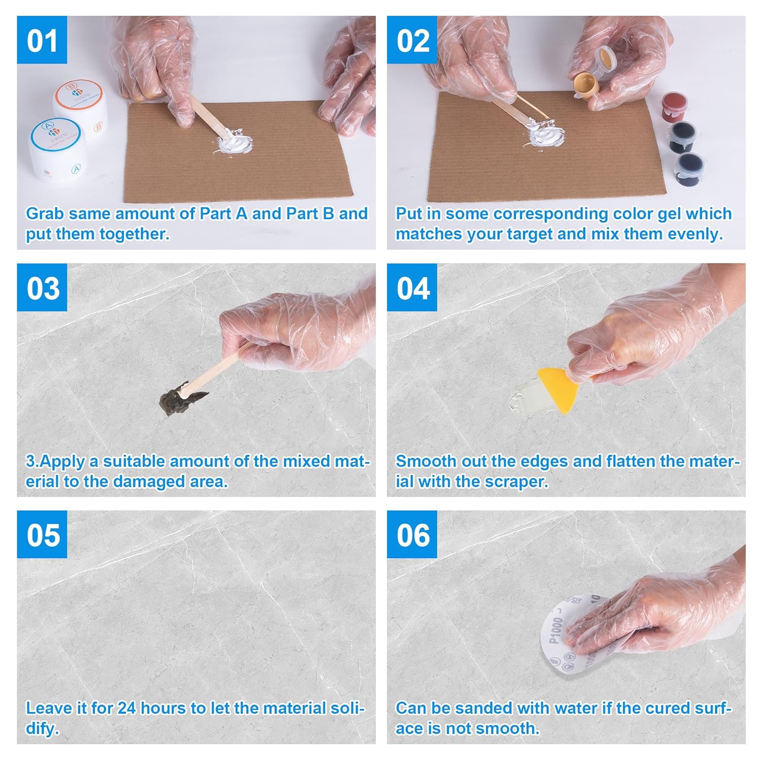 - Durable and Waterproof Finish – Once fully cured in 12 hours, the repaired area becomes as hard and resilient as the original surface. It provides long-lasting protection against moisture, stains, and wear, ensuring your surfaces remain flawless over time.