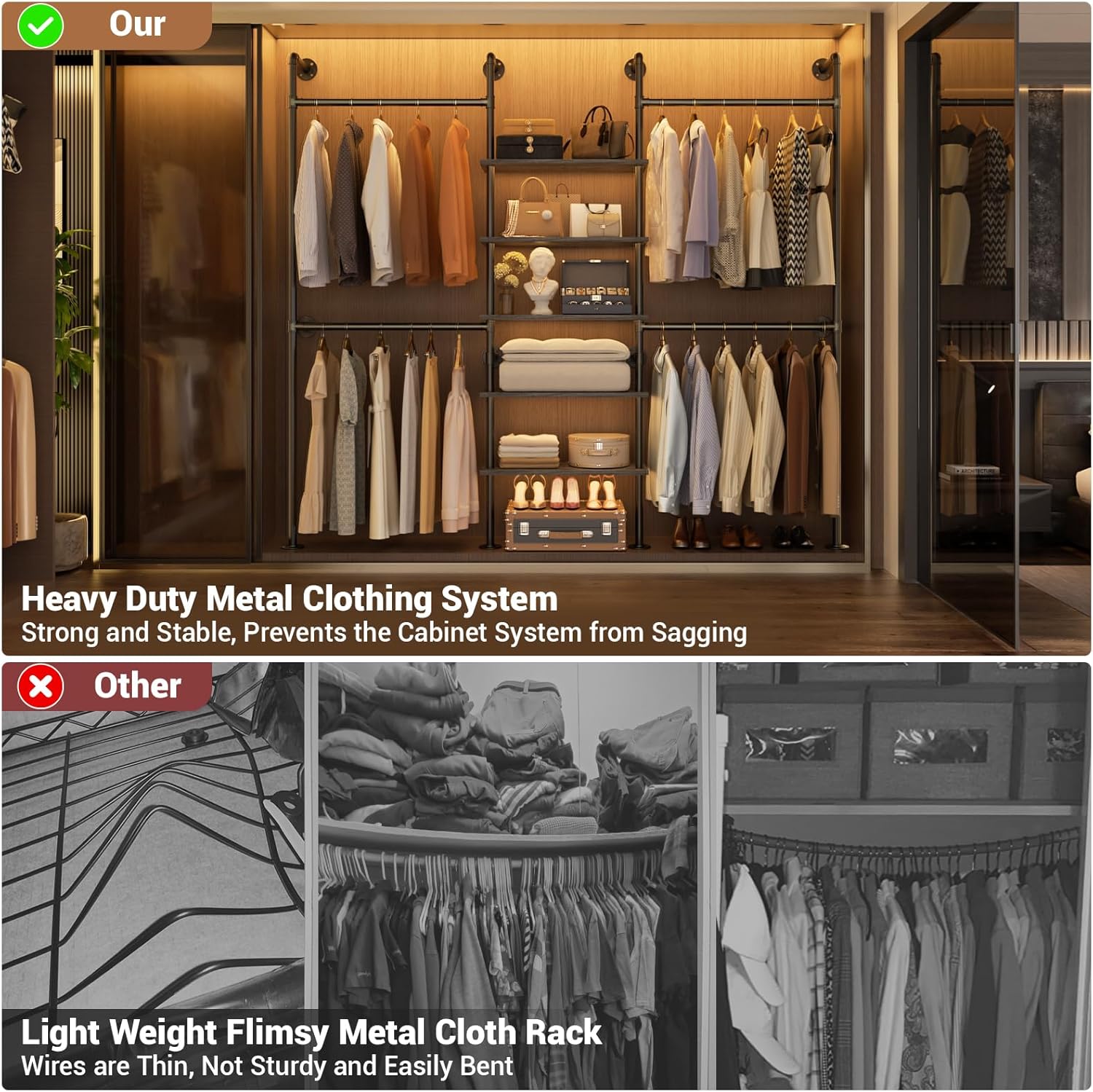 - 【Strong Bearing Capacity】This multifunctional Walk-in Closet System consists of vintage industrial pipe clothes rack that contains 4 detachable heavy duty metal hanging rods and 5 storage shelves, modular devise for flexible configuration, load capacity up to 800lbs, not easily deformed and wobble. Dimensions: 77" L x 13.8" W x 86.5"H.