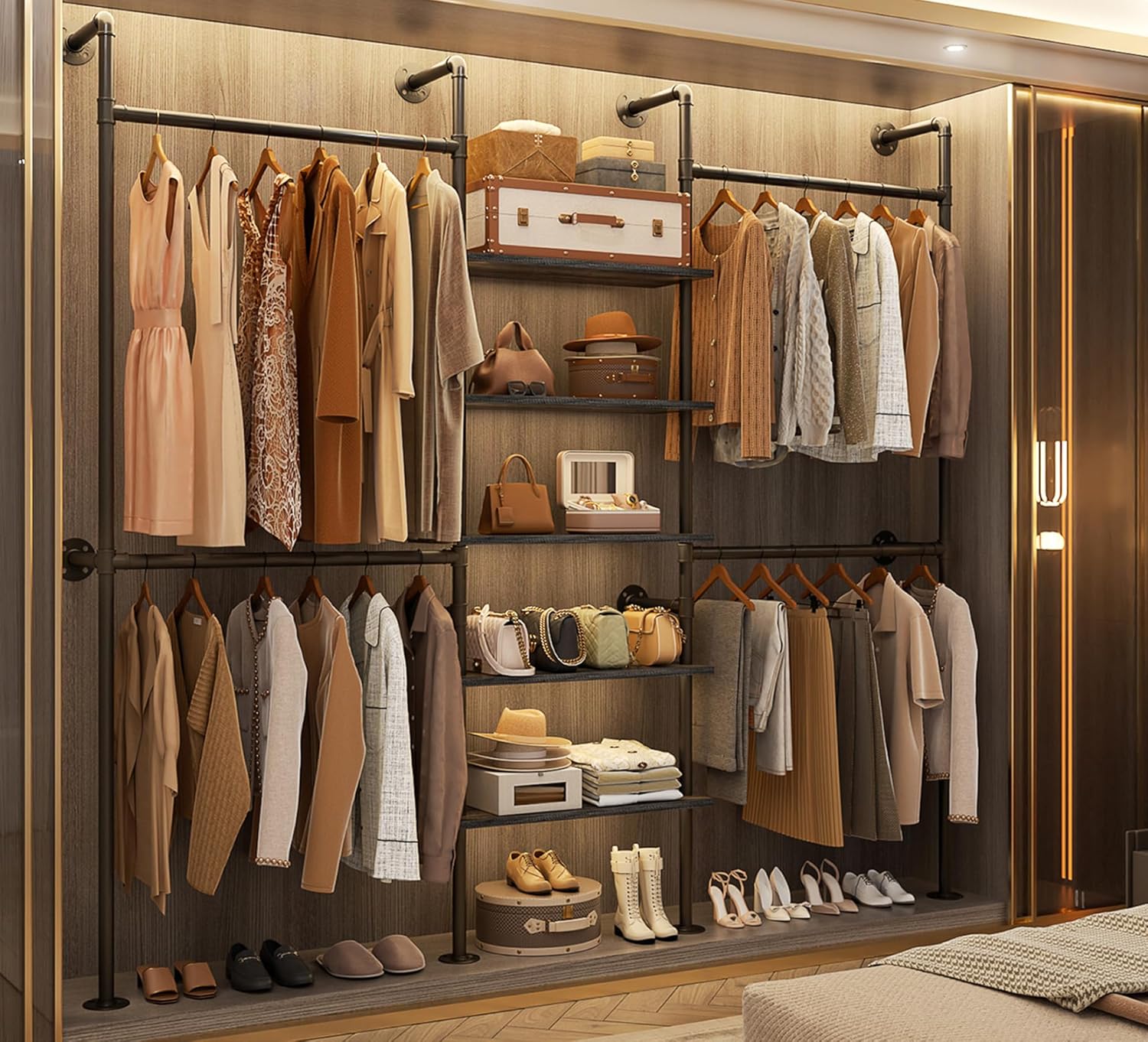- 【4 Installation Methods】Our industrial Clothing Rack has various Installation methods to fit your different storage needs. L shape for small spaces like corner, apartment, bedroom; Straight-lined shape for walk-in closet and cloakroom clothing store. our garment rack complements contemporary, farmhouse, or vintage decor styles with its sleek design.