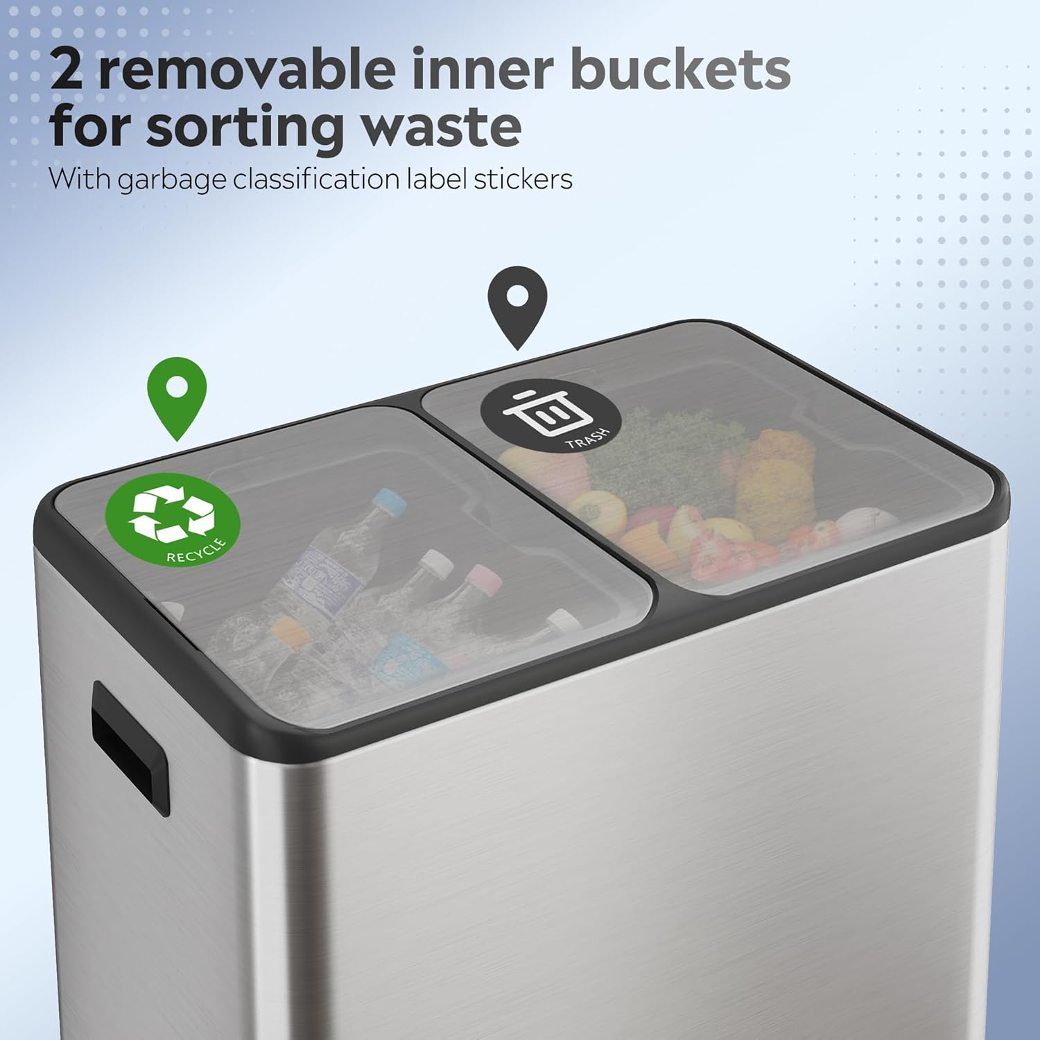 WLIVE 2 x 8 Gallon / 2 x 30 Liter Dual Trash Can, Stainless Steel Double Compartment Classified Kitchen Trash Can, with Plastic Inner Buckets, Handles, Soft-Close Lid, Deodorizing Filter Box, Silver.