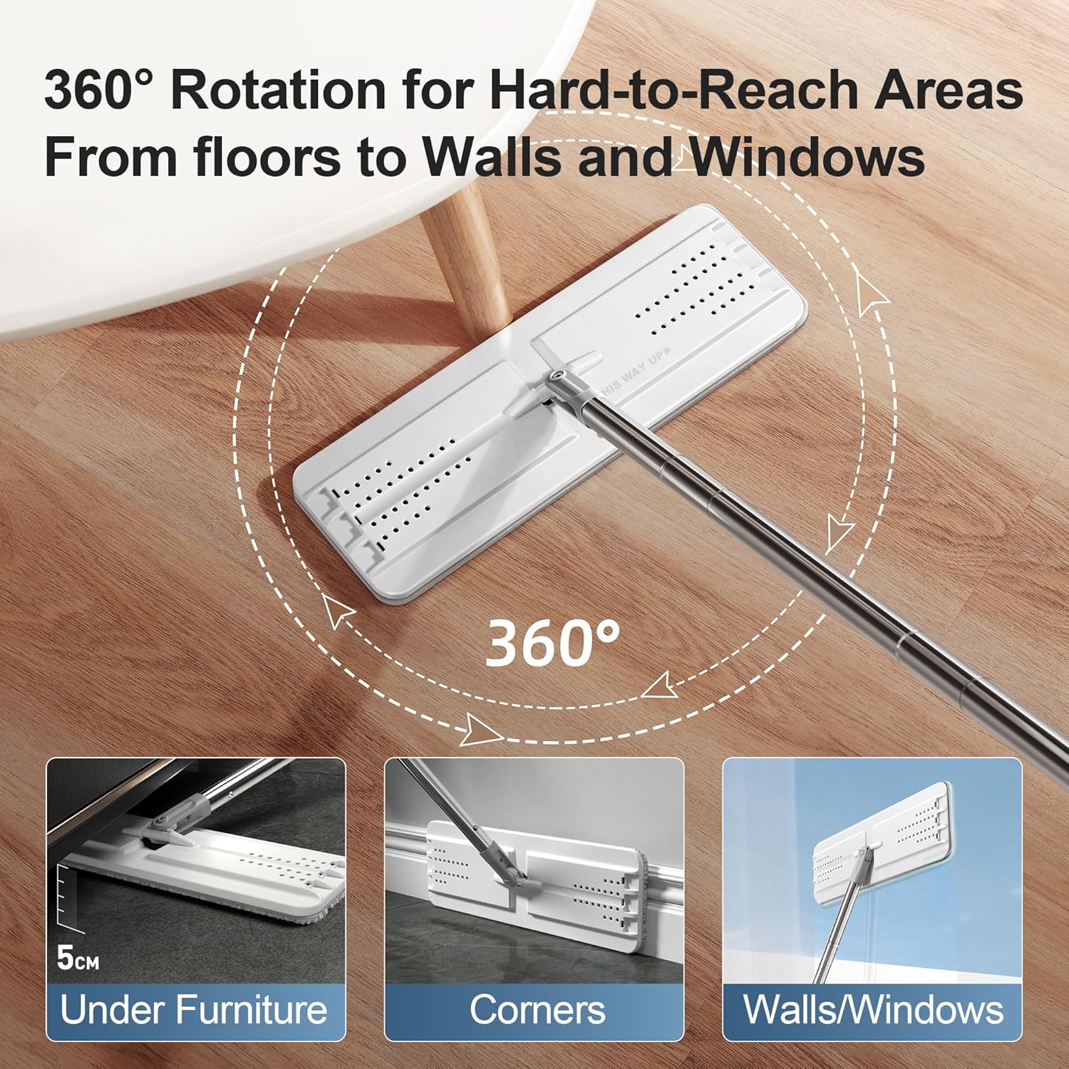 - [Extended Microfiber Mop] With 360ยฐrotation and bigger mop head, the flat mop can reach to any corners, those "under-the-whatever" and more wider places for much faster cleaning job! The adjustable Stainless Steel Handles can be extended from 26.5 to 60.0 inches, great for wet dry mops or dust mops for wall cleaning