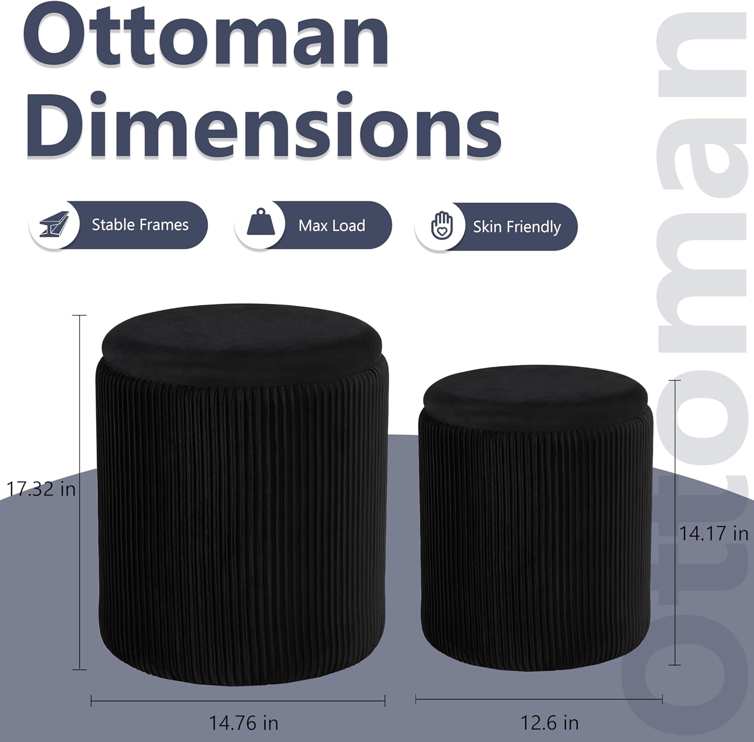 - 【Perfect Set Design】This round storage ottoman comes in a set of two, with the larger size measuring 14.76" x 14.76" x 17.32" and the smaller size 12.6" x 12.6" x 14.17". These two round storage ottomans can be neatly stacked together, offering a convenient space-saving solution.