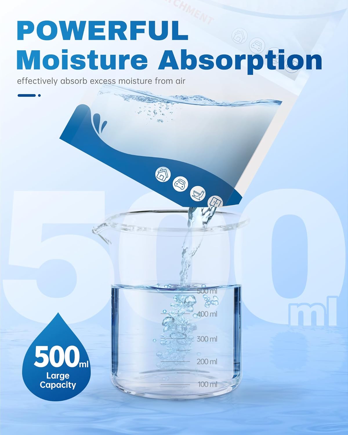 - EFFECTIVE ABSORBING: Vacplus dehumidifier bags use Spherical calcium chloride to enlarge the area to absorb quickly. One-way moisture permeable paper absorbs effectively. 500 ml/pack large capacity moisture absorption keep dry for a long time.