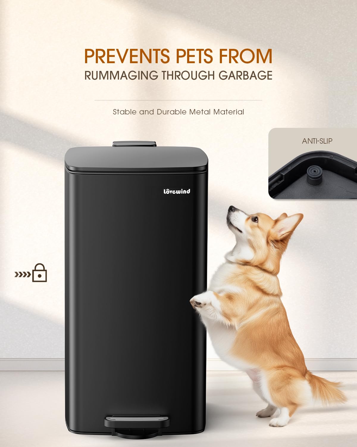 Lovewind Kitchen Trash Can with Lid, 8 Gallon/30 L Footstep Garbage Can for Kitchen Bedroom Home Office, 30 Liter Trash Bin Brushed Stainless Steel Waste Bin with Soft-Close Lid,Black