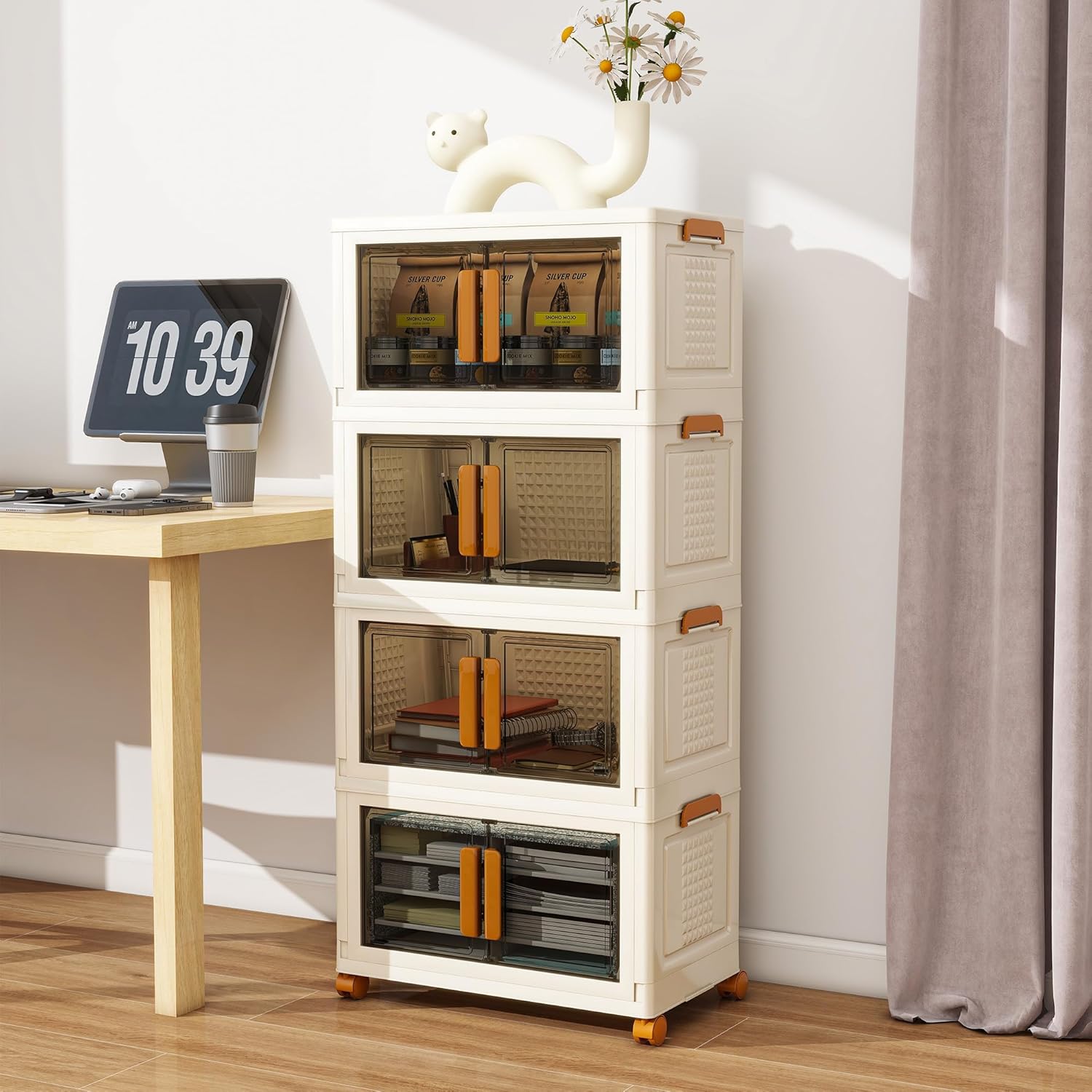 4 Tier Stackable Plastic Storage Bins with 1 Lid 45 QT/Tier, Collapsible Plastic Box Storage Bin with Wheels, Home Containers Boxes Closet Organizers for Living Room, Office, Dorm