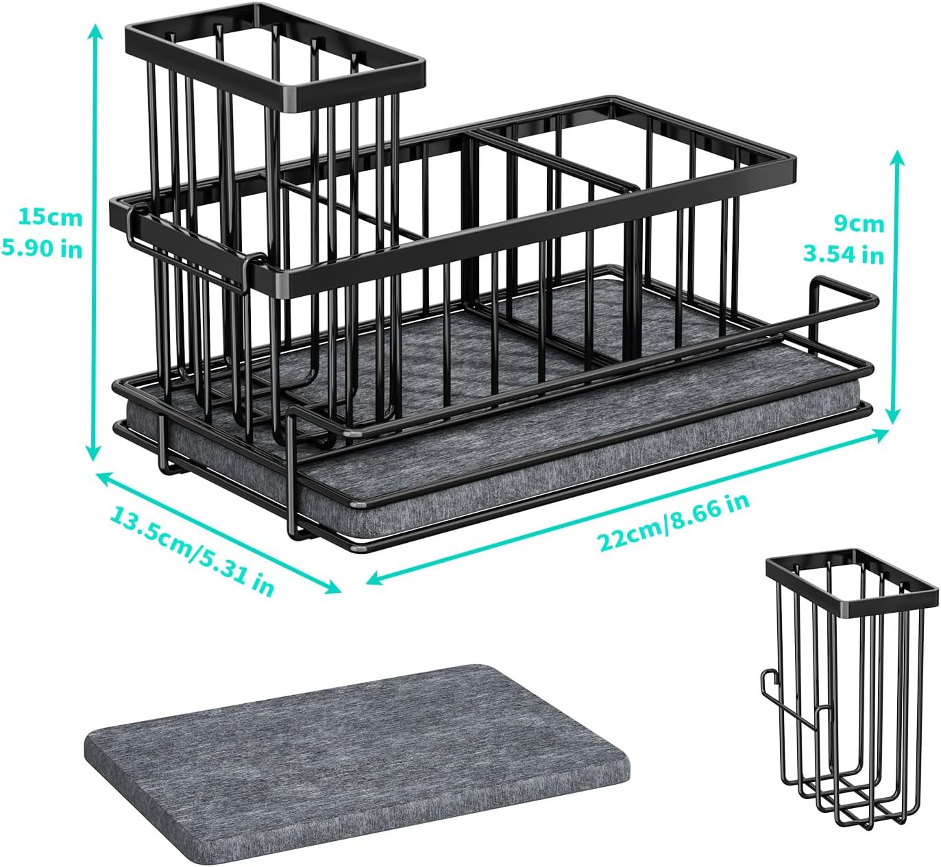 - [Instant Dry Sink Caddy]: The bottom of our sponge holder is made of diatomaceous earth absorbent mat, which automatically absorbs water and dries in 60 seconds, no longer need to manually pour water.The mat is removable, so you can remove it for cleaning