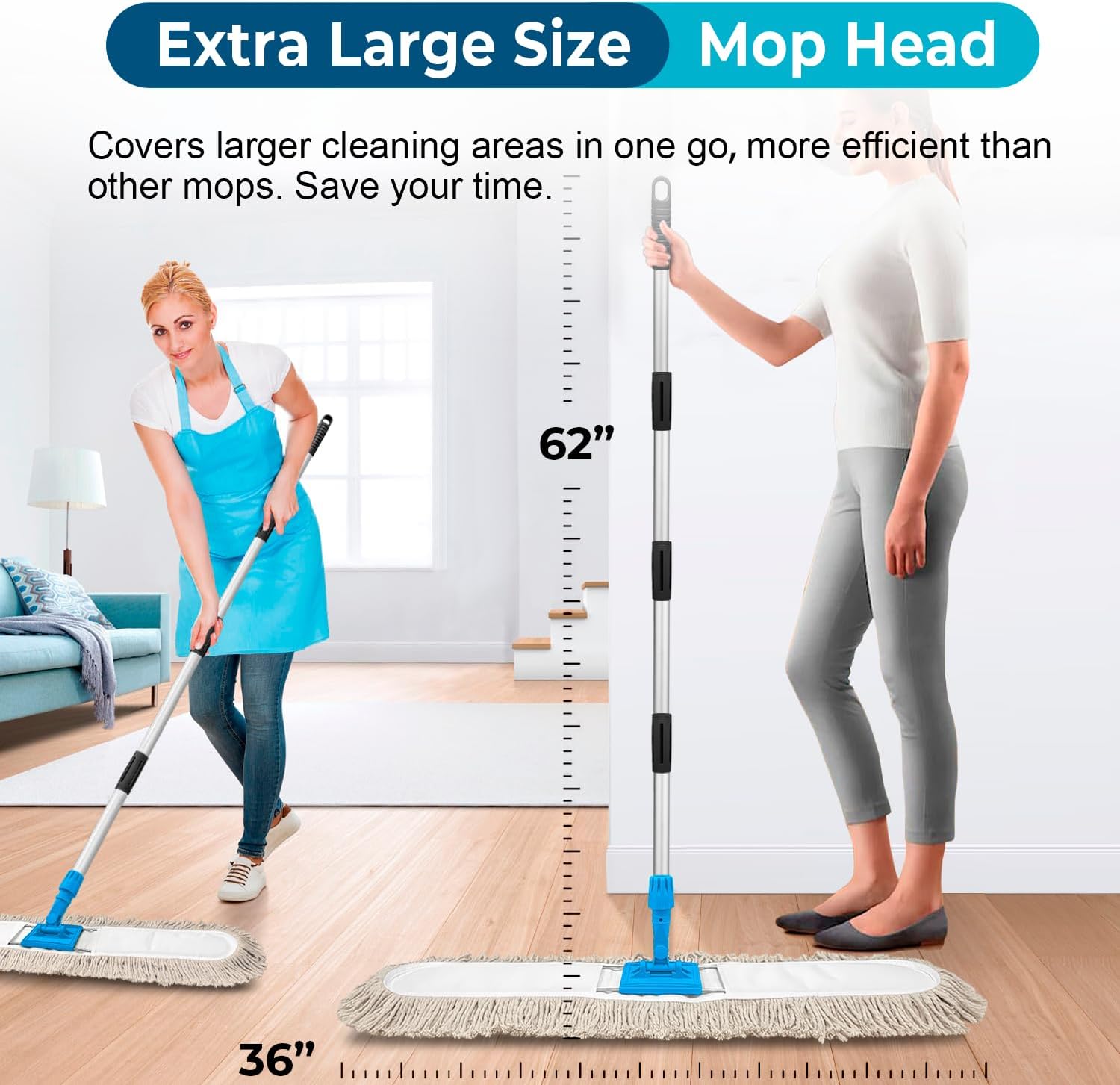 36” Commercial Dust Mop for Floor Cleaning, Industrial Dry Mop with Heavy Duty Long Handle, Large Cotton Reusable mop Head, for Cleaning Office Garage Hardwood Warehouse Factory Mall