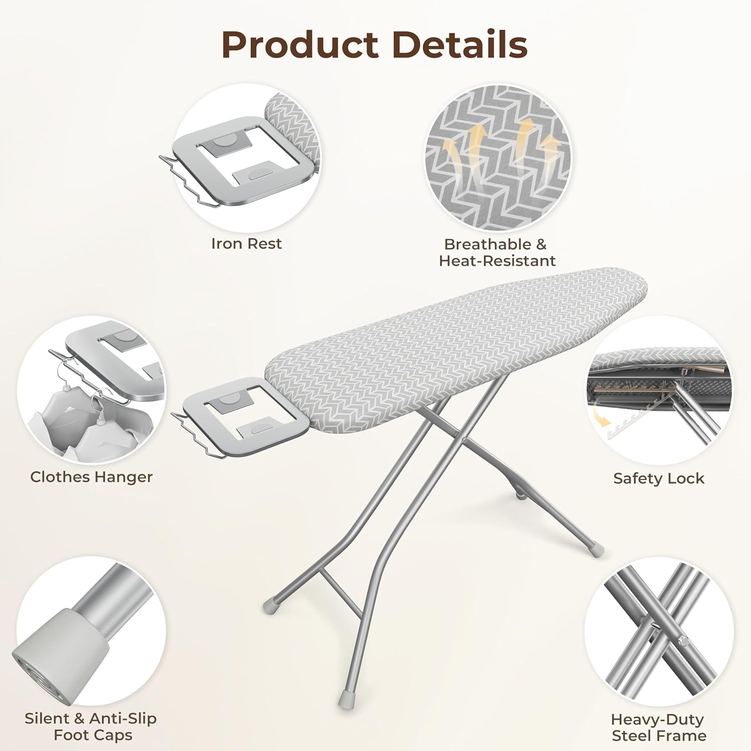 - Adjustable Height: With nine adjustable height settings ranging from 21″ to 36″, this ironing board can be adjusted by a safety lock to fit your comfort level, making it ideal for various working occasions