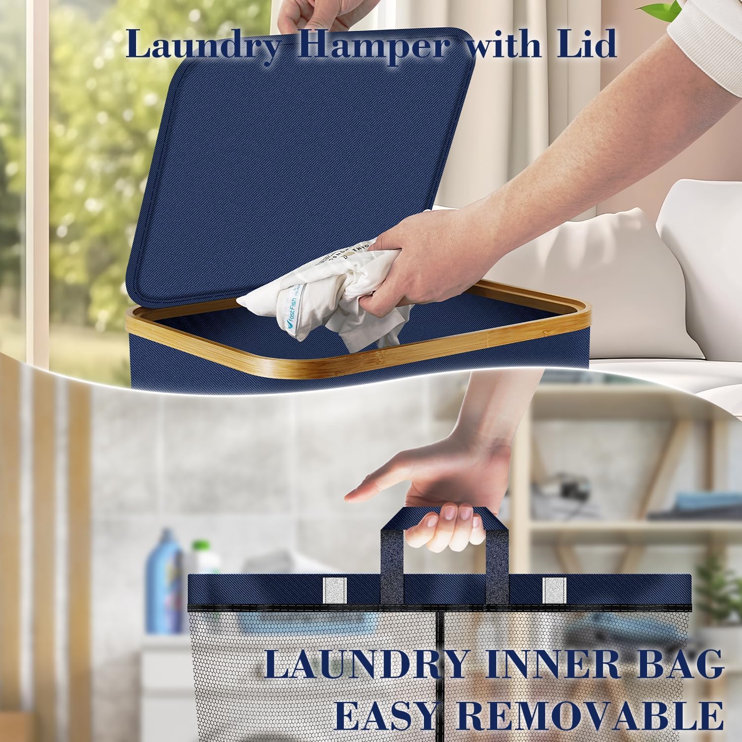 Laundry Hamper with Wheels,20 Gal (75L) Laundry Basket with lid Rolling Clothes Hamper Foldable Dirty Clothes Basket on wheels with Bamboo Frame and Bag for Bedroom, Dorm, Laundry Room-Blue