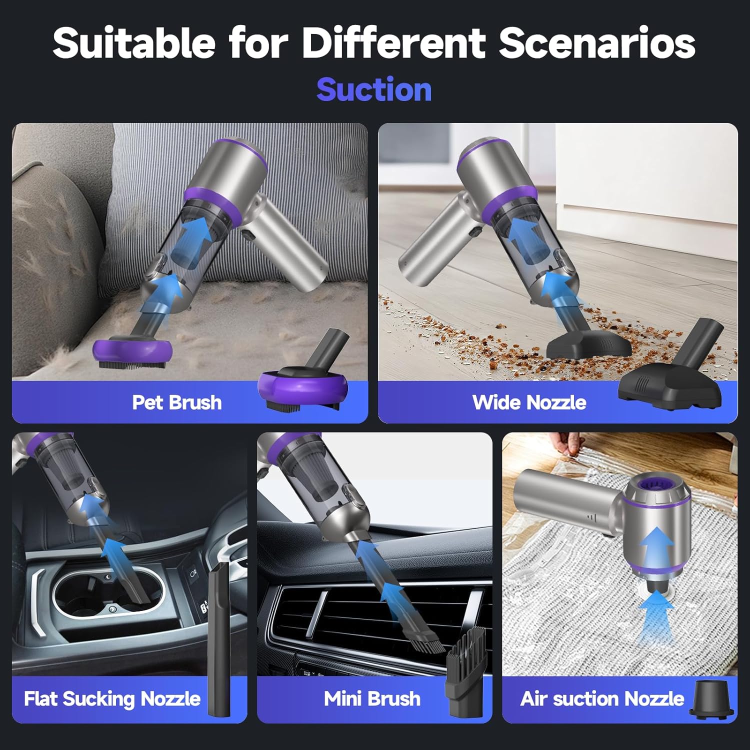 - 【Multi-functional Accessories for Comprehensive Cleaning】The cordless car vacuum set includes 10 tools including a soft brush (for dashboard), a hard brush (for cleaning tire grooves), an extended flat nozzle (for penetrating seat gaps), and a multi-functional two-in-one suction head (suitable for dry debris and light moisture) that can be used for vacuuming, blowing, inflating, and compressing to meet the needs of multiple scenarios in cars, homes, and offices