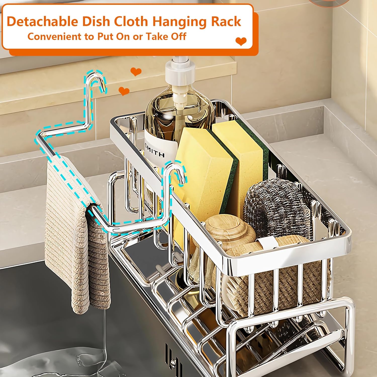 - [Removable Dishcloth Rack]Keeps the sink clean and hygienic! Detachable dish towel rack for quick drying and easy hanging or removal of dish towels when needed. Our stainless steel sink caddy holder can be used without installation. Desktop sink caddy kitchen sponge holder, say goodbye to messy cleaning