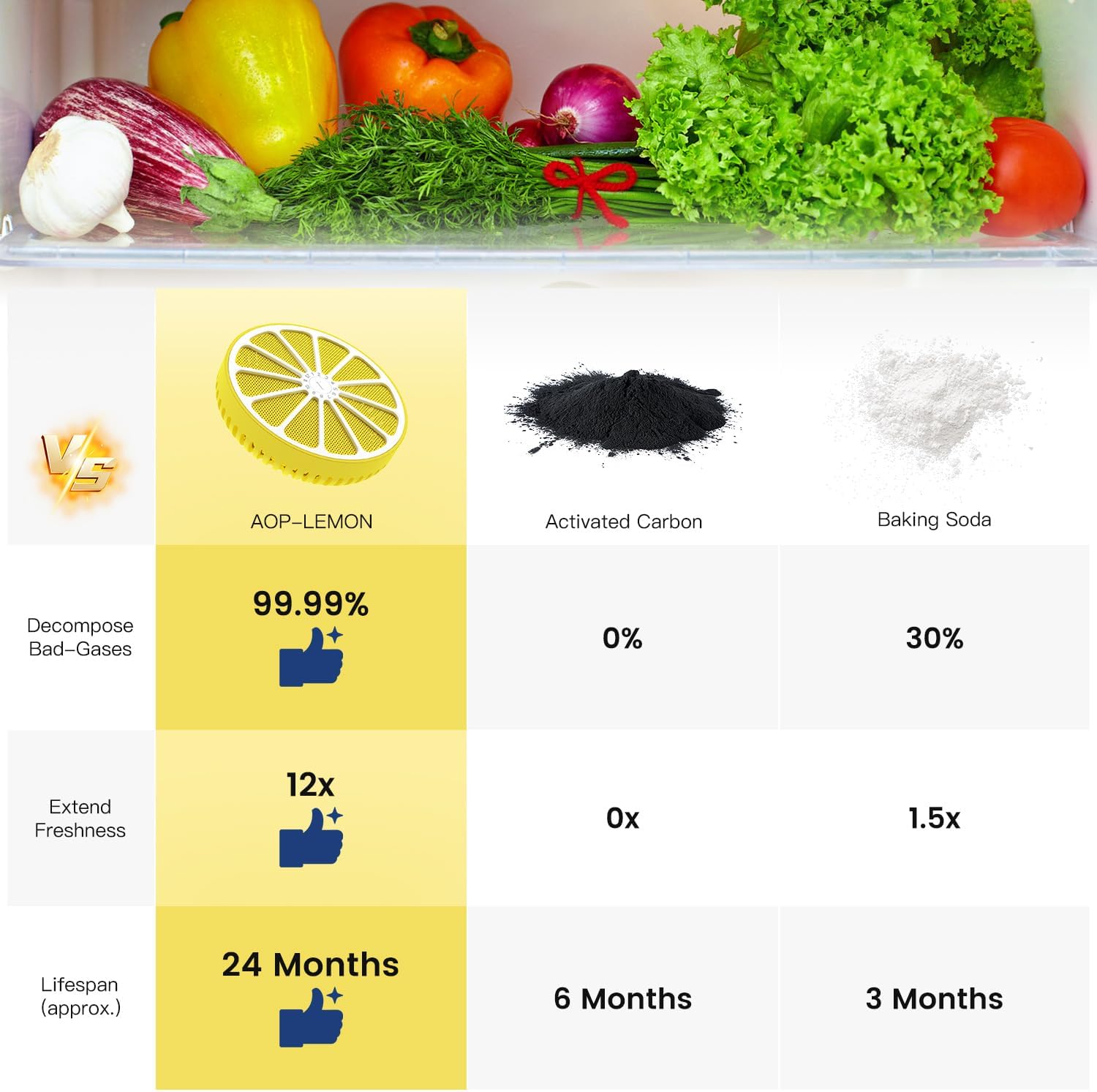 Refrigerator Deodorizer for Kitchen & Small Spaces, 2 Years Fresh Odor Eliminator for Fridge with AOP-KF Solid Alkali Tech, Lemon Design & Adjustable Clip Design (2.7"/50g)