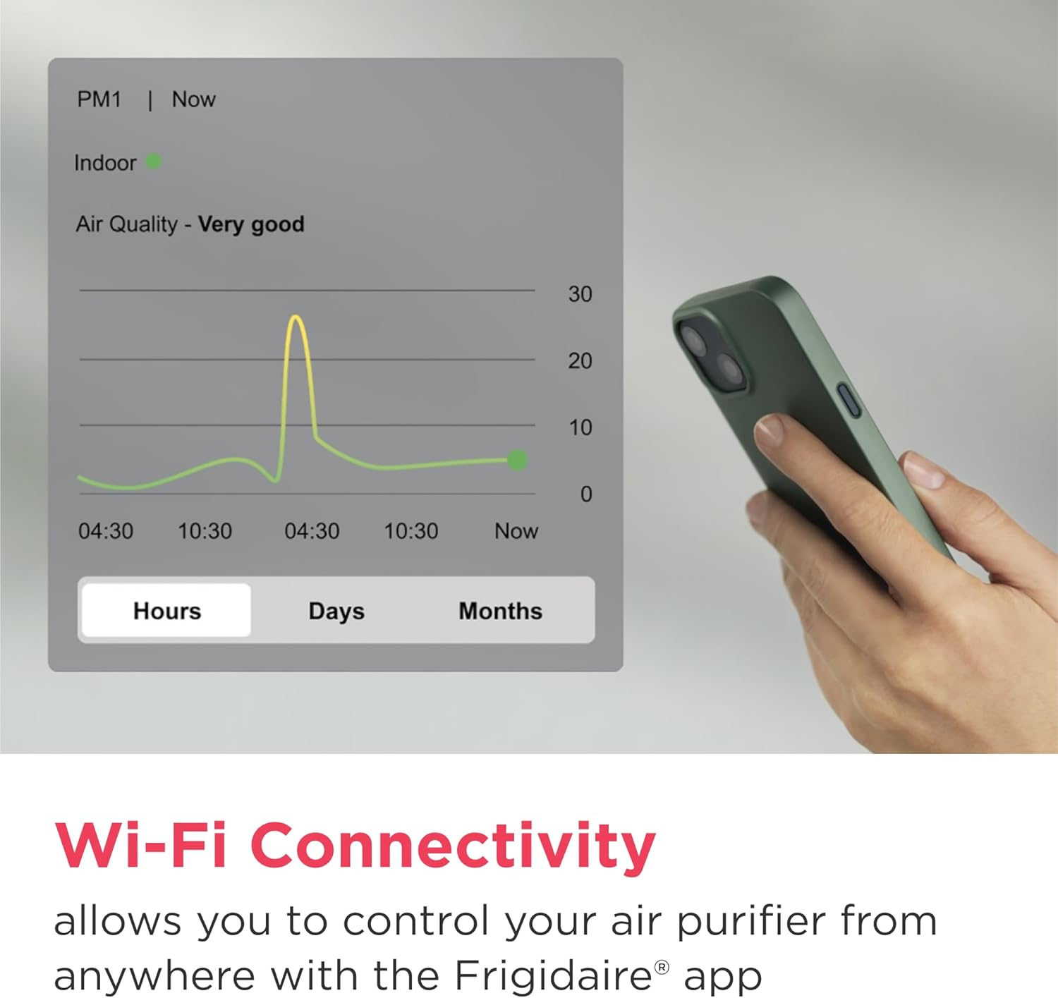 - Wi-Fi Enabled Control: Manage your air purifier from anywhere with the Frigidaire app, allowing you to set schedules, track air quality, adjust settings, and monitor filter life effortlessly