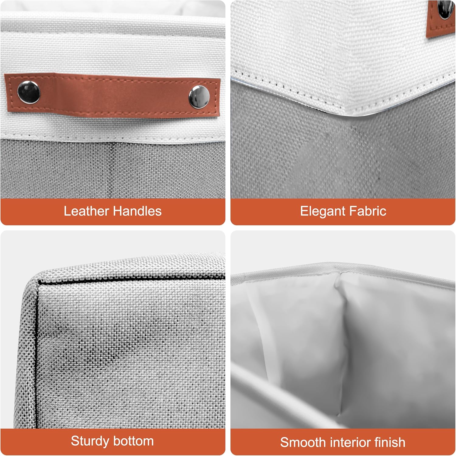13in Open Fabric Storage Basket with Leather Handles for Organizing, Collapsible Linen Closet Bins for Shelves, Closets, Laundry, Decorative Basket for Gifts. (White&Gray, 3PCS/13x13in)