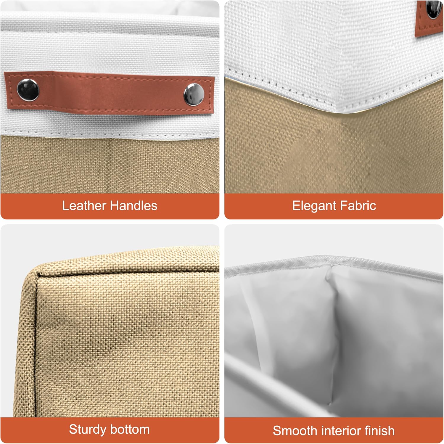 12in Open Fabric Storage Basket with Leather Handles for Organizing, Collapsible Linen Closet Bins for Shelves, Closets, Laundry, Decorative Basket for Gifts. (White&Khaki, 2PCS/12x12in)