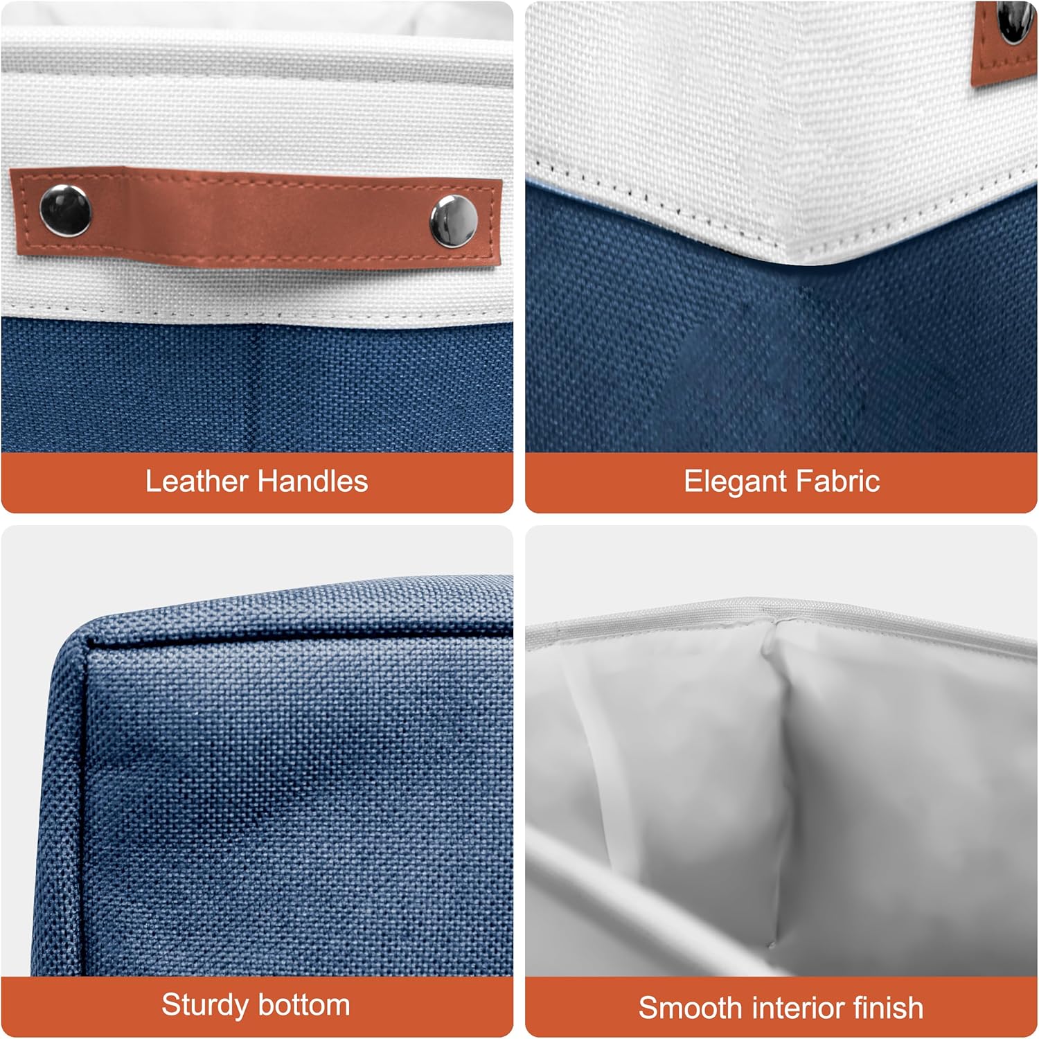 13in Open Fabric Storage Basket with Leather Handles for Organizing, Collapsible Linen Closet Bins for Shelves, Closets, Laundry, Decorative Basket for Gifts. (White&Blue, 2PCS/13x13in)