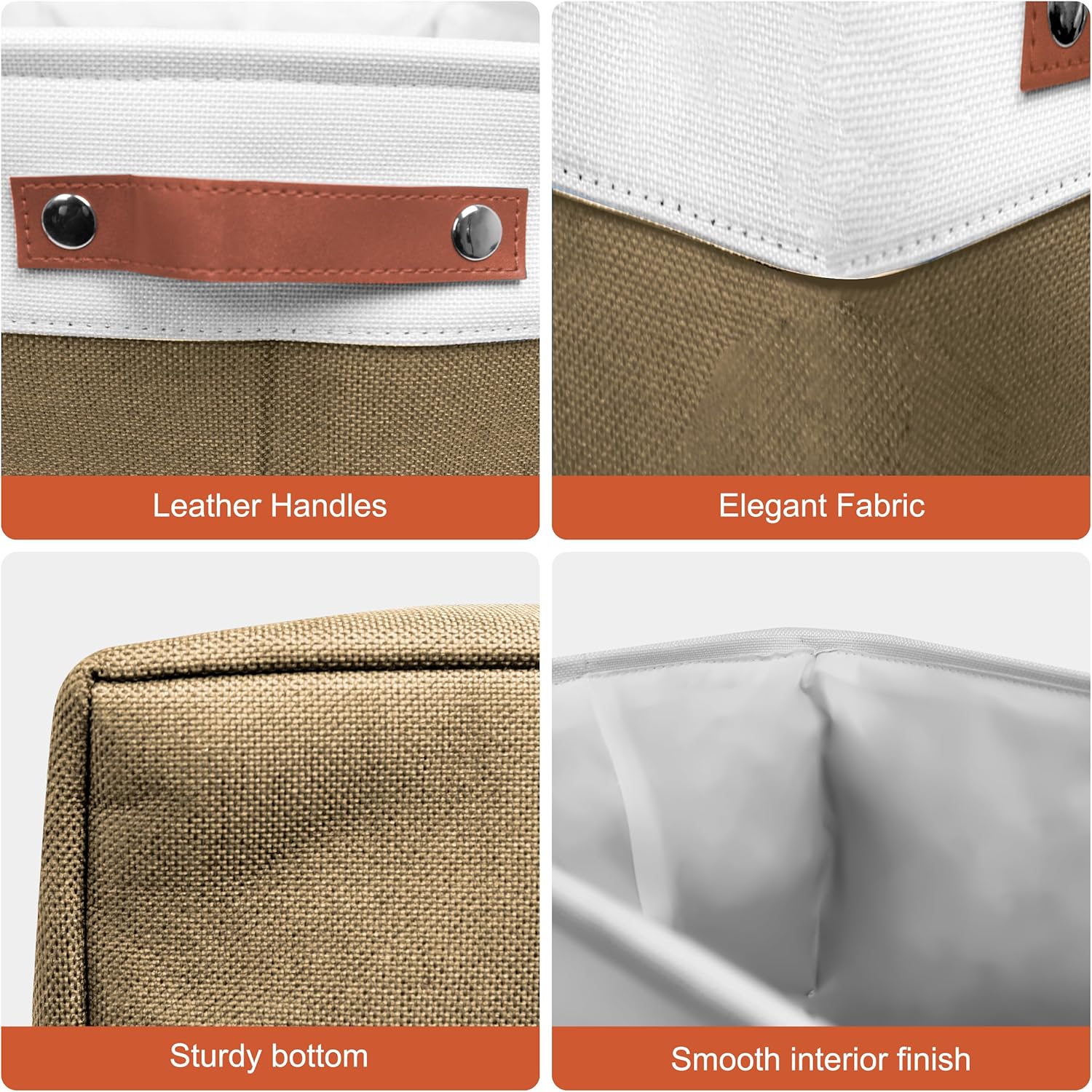 11in Open Fabric Storage Basket with Leather Handles for Organizing, Collapsible Linen Closet Bins for Shelves, Closets, Laundry, Decorative Basket for Gifts. (White&Brown, 3PCS/11x11in)