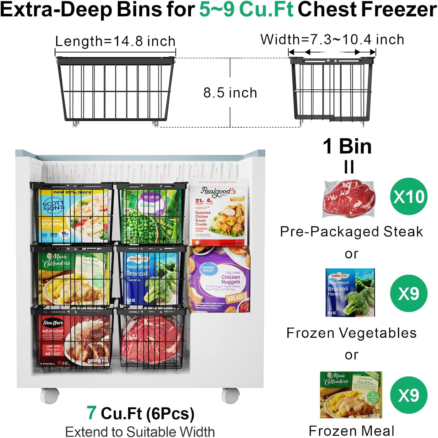 - [Customizable Fit for 5/7/9 cu ft Freezer]: iSPECLE freezer organizer bins measure 14.8" L x 7.1" to 10.63" W x 8.46" H; Adjust the width to fit chest freezers perfectly; Holds 3 bins for 5 cu ft and 6 bins for 7/9 cu ft freezer, maximize freezer space efficiency