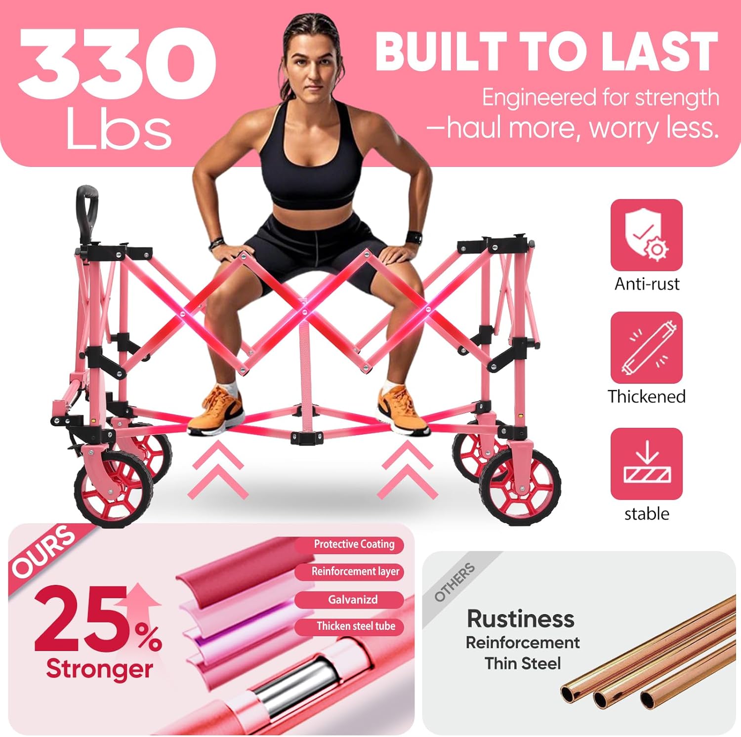 Sekey Pink Collapsible Foldable Wagon with 330lbs Weight Capacity, Heavy Duty Folding Wagon Cart with Big All-Terrain Wheels & Drink Holders. Pink