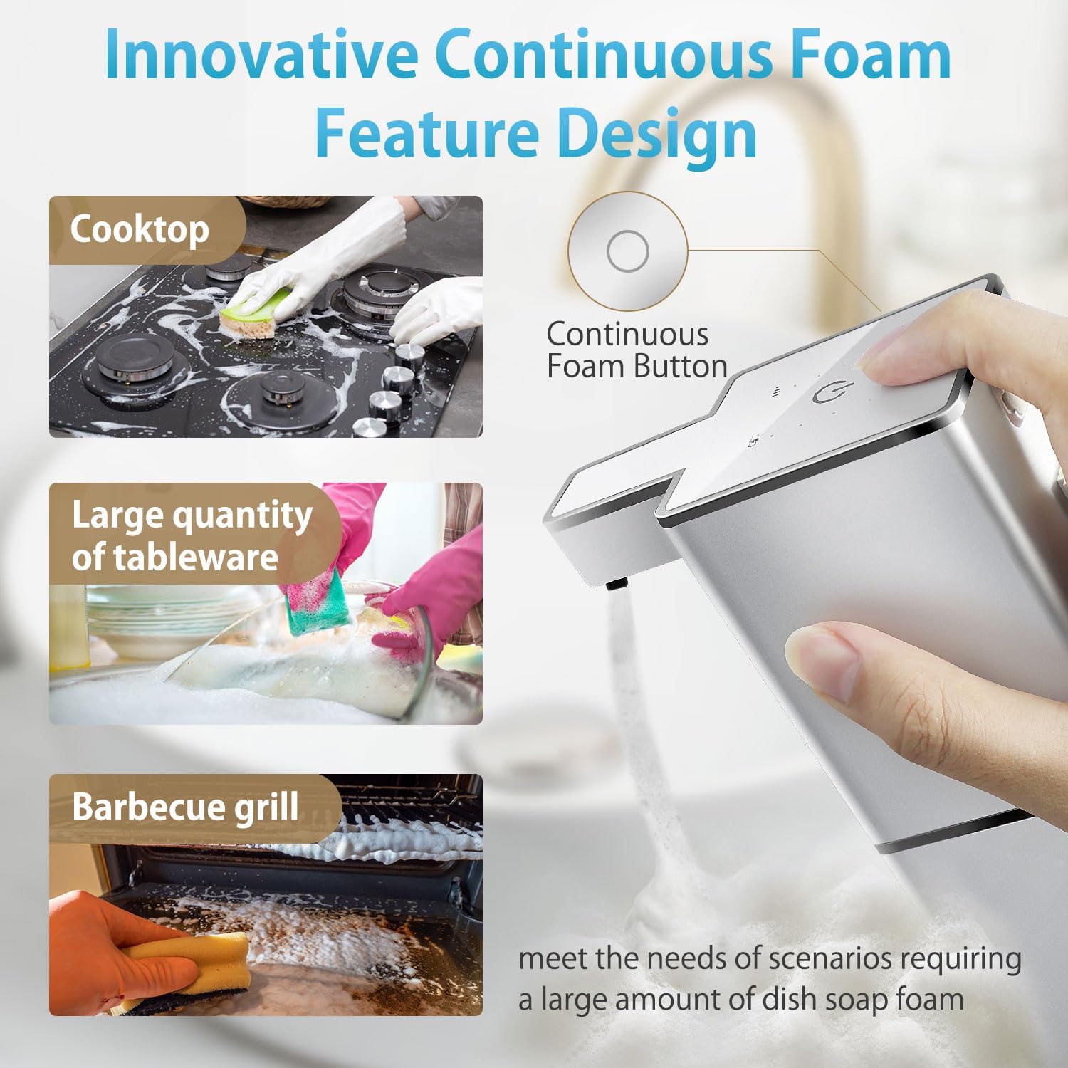 - 【Continuous Foam Design】 With a simple press of the continuous foam button, a steady stream of foam is effortlessly dispensed. This feature is perfect for tasks requiring large amounts of foaming soap, such as washing multiple utensils, cleaning stovetops, dining tables, barbecue grills, and more.