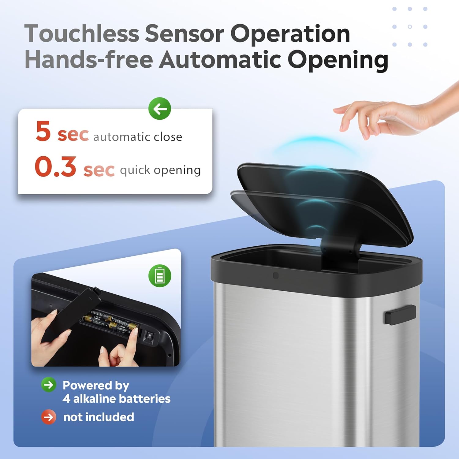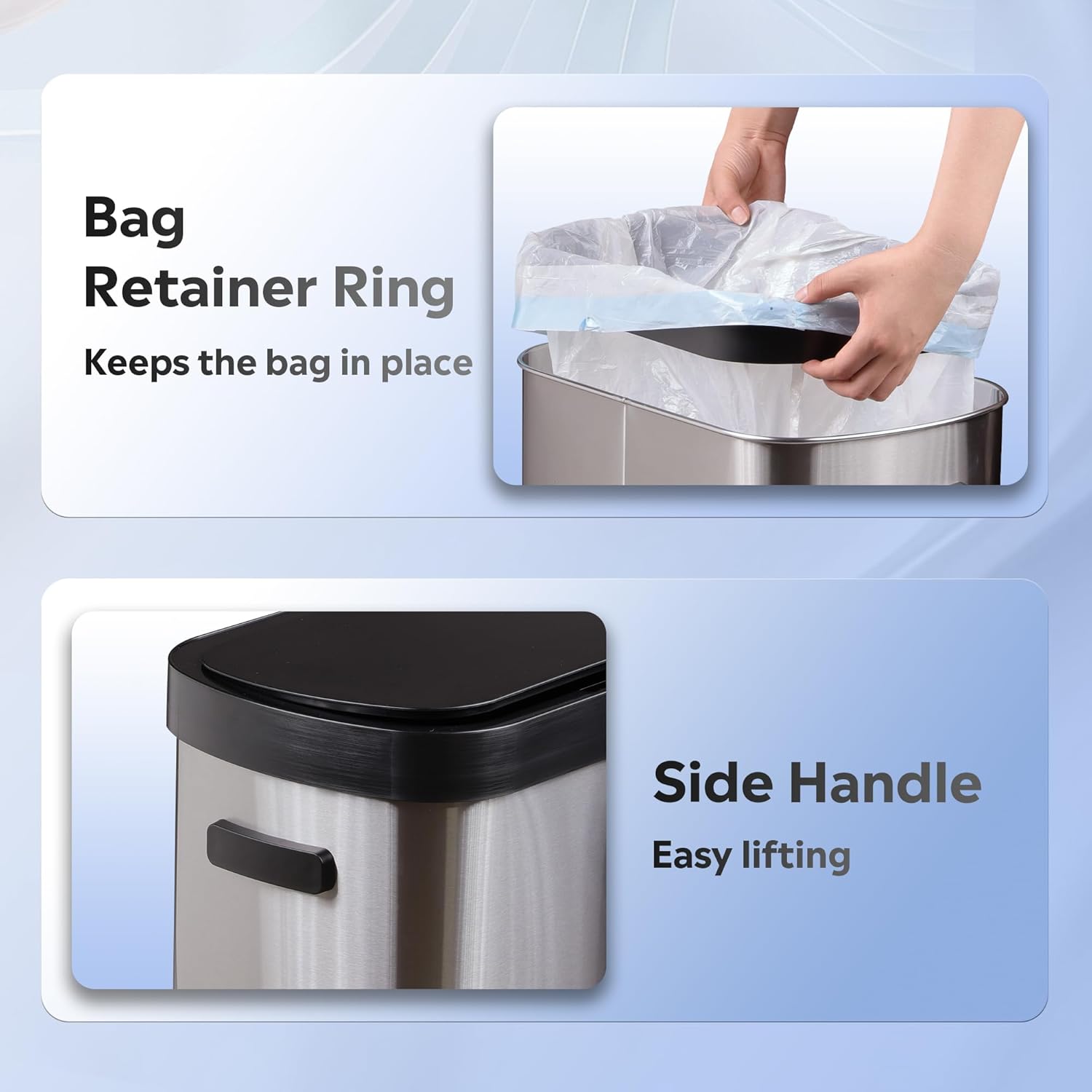 - 【Durable & Stylish】Crafted with anti-fingerprint stainless steel, this touchless trash can resists smudges while maintaining a sleek, scratch-resistant finish. Durable and visually versatile, it blends effortlessly into any decor.