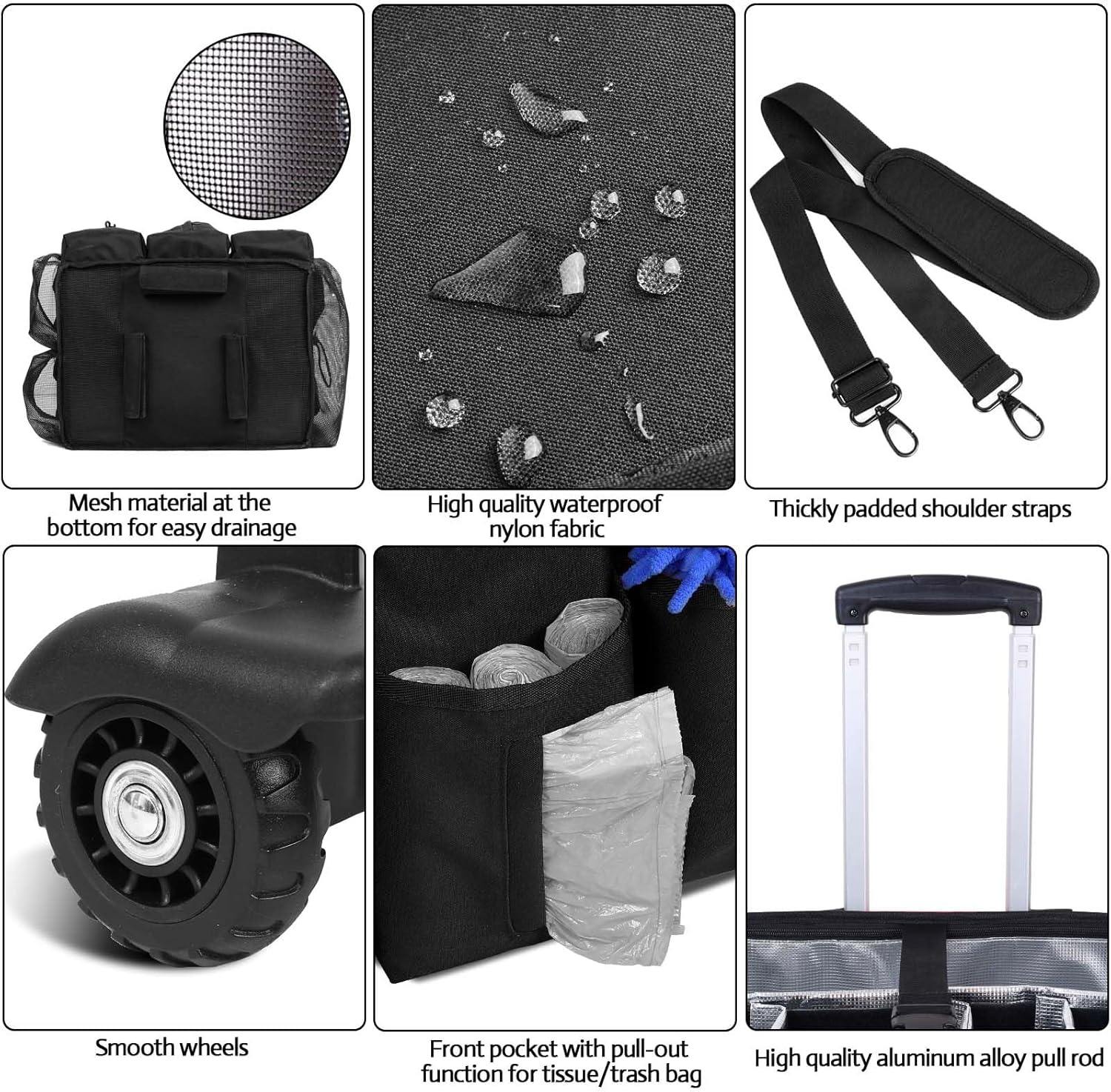 Extra Large Rolling Cleaning Caddy Bag with Detachable, Foldable Trolley Portable Cleaning Cart for Housekeeping Cleaning Caddy with Adjustable Shoulder Strap and Multiple Storage Pockets