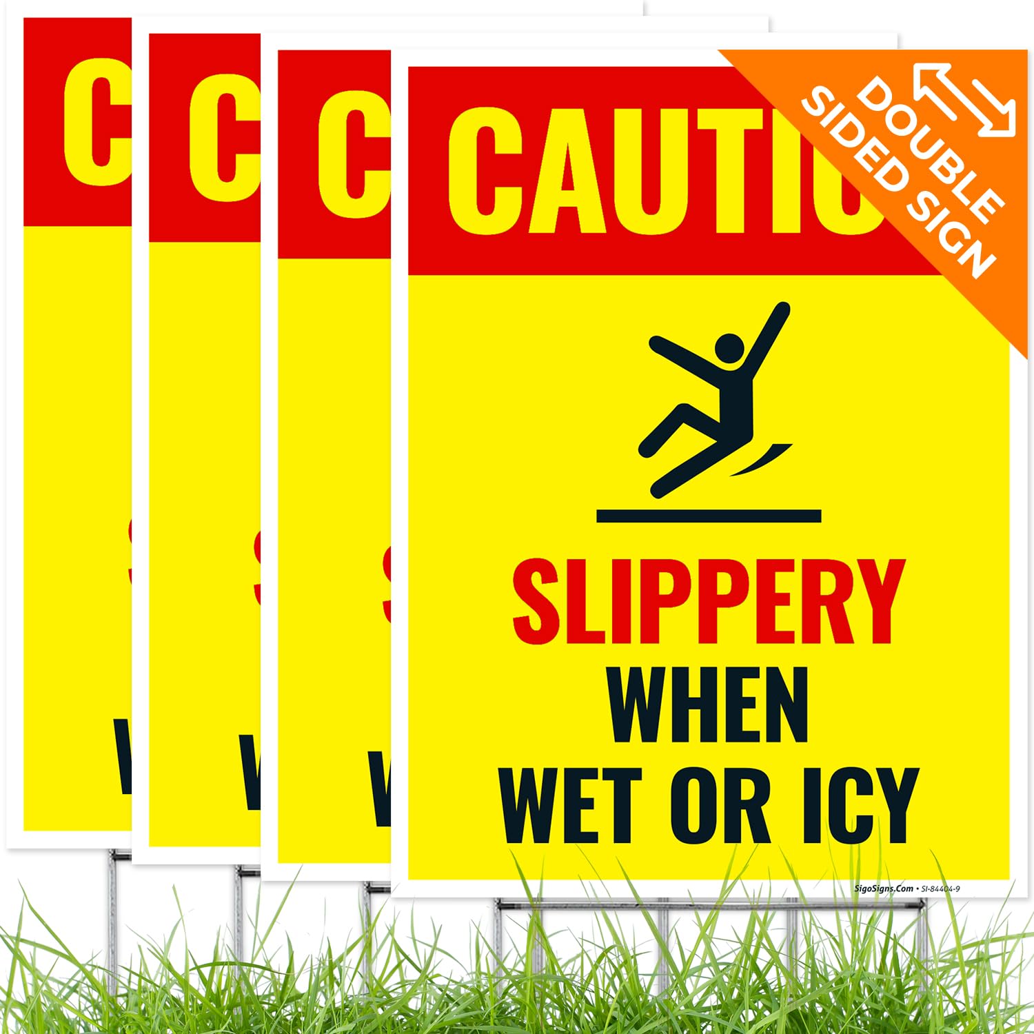 Caution Slippery When Wet or ICY Sign, (SI-84404) (4 Pack) Double Sided 9x12 Inches, Corrugated Plastic with Metal H Stake, Made in USA by Sigo Signs