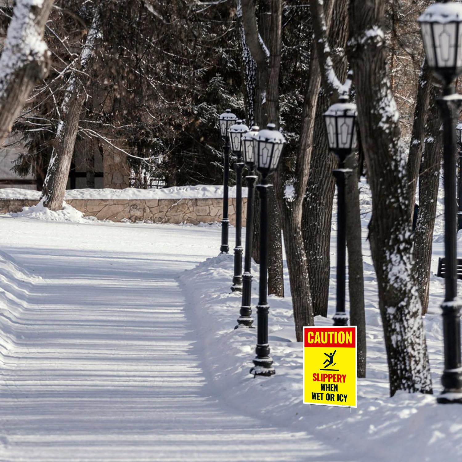 Caution Slippery When Wet or ICY Sign, (SI-84404) (2 Pack) Double Sided 9x12 Inches, Corrugated Plastic with Metal H Stake, Made in USA by Sigo Signs