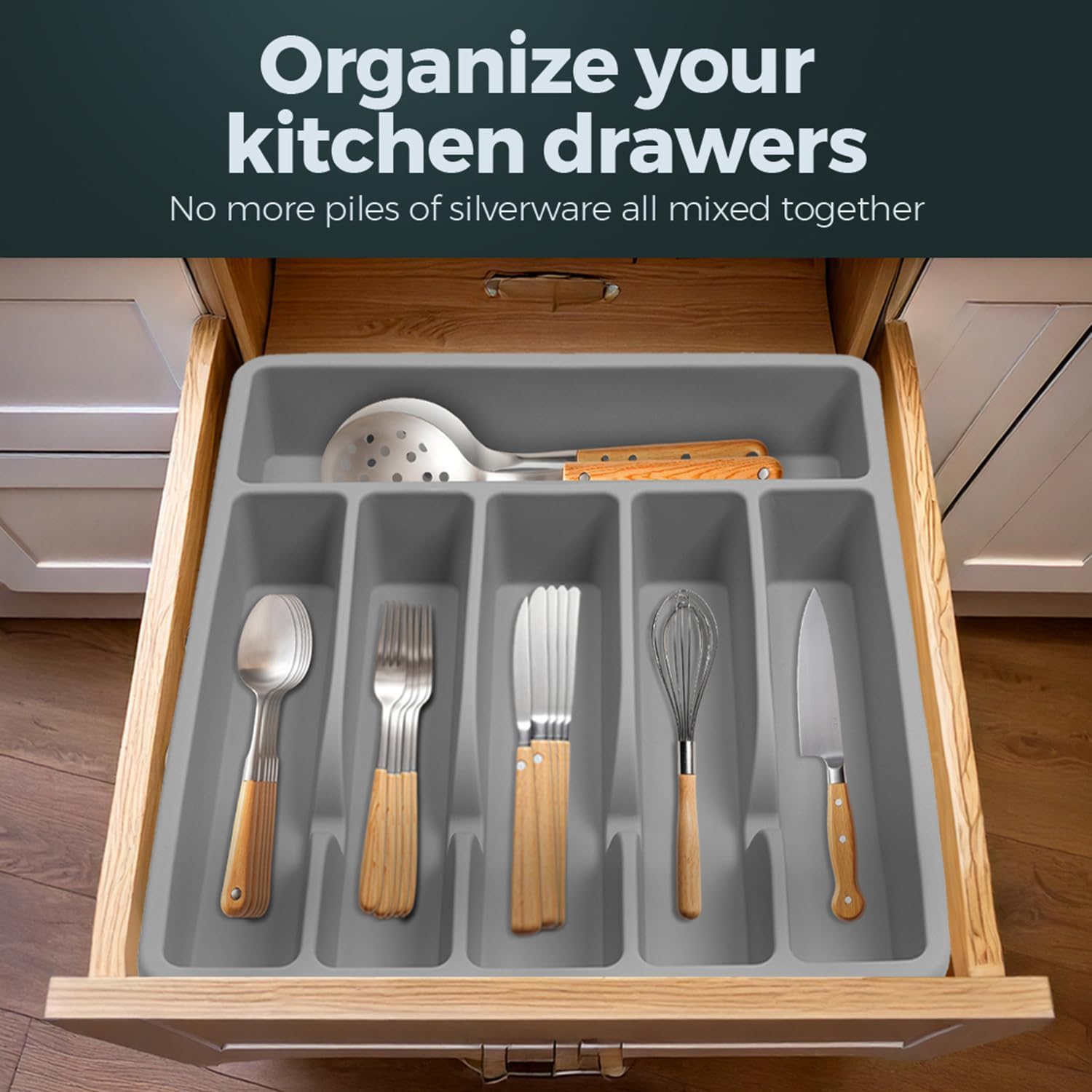 Silicone Silverware Drawer Organizer – Non-Slip Utensil Holder for Kitchen Drawers | Cutlery Tray for Forks, Knives, Spoons & More | Durable, BPA-Free, Easy to Clean – Gray