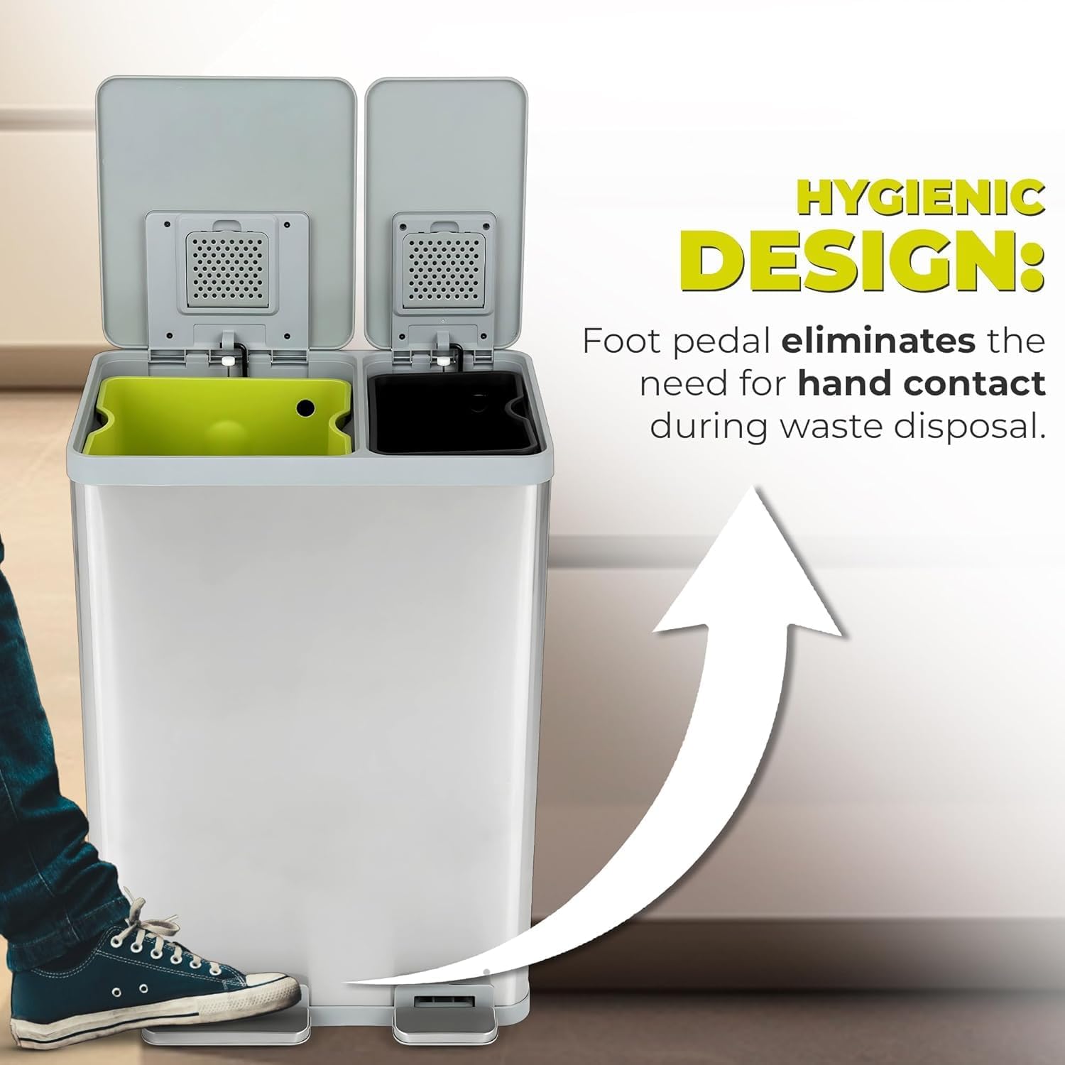 - HIGH CAPACITY WASTE AND RECYCLING SOLUTION: Color coded liners in Green (38L) and Black (22L) allow for easy sortation of waste and recycling, without sacrificing waste capacity, and fit standard liners using bag cinch.
