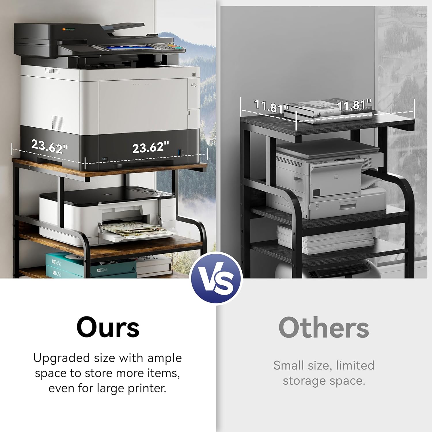 - 【Multi-Level Organization Hub】 Four 23.62”x23.62” tiers hold printers, scanners, file boxes, and office supplies in one centralized unit. Open-grid design integrates with desk hutches or corner printer stands for seamless workflow. Supports 110 lbs/shelf—perfect for large printer stands or commercial 3 tier rolling cart needs. Extra height accommodates vertical file storage!