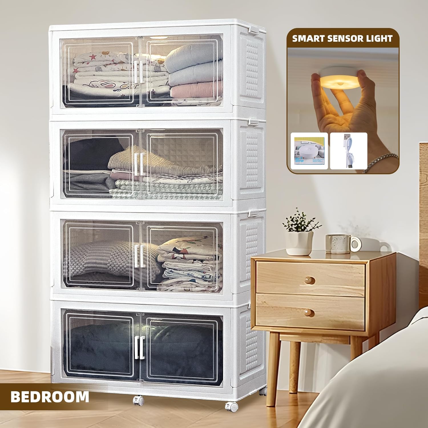 752QT/188Gal 4 Stackable Storage Bins with Lid and 8 doors, Motion Sensor Lights in Cabinets, Large Collapsible Container Box with 6 Wheels, Plastic Foldable Organizer for Home - Pure White