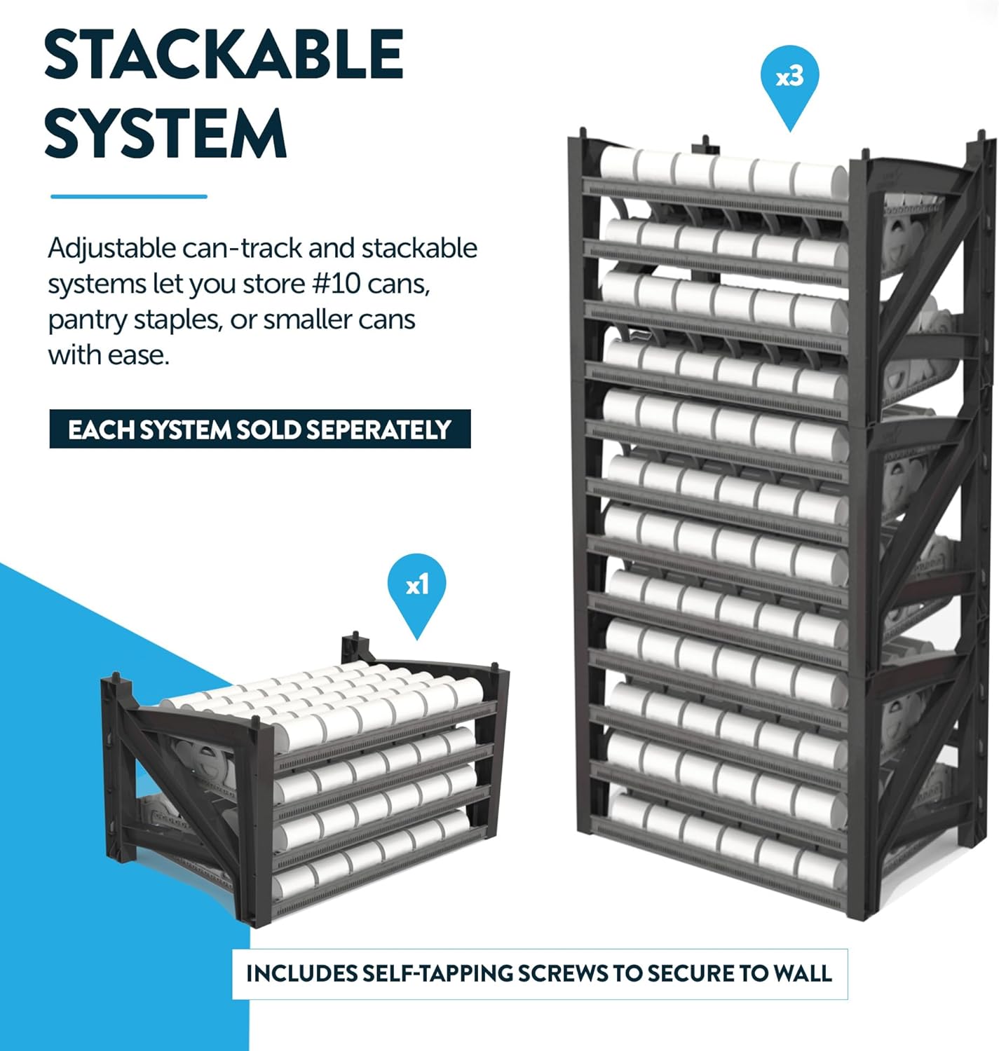 - STACKABLE CAN ORGANIZER FOR PANTRY - This food can organizer is built to stack and expand, helping you make the most of your pantry space. Add extra panels, expand with more units, and create a setup that grows with your storage needs.